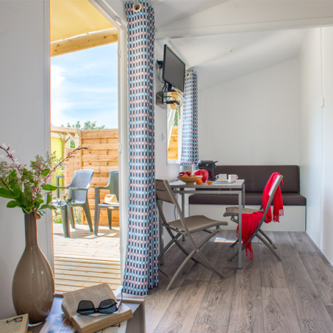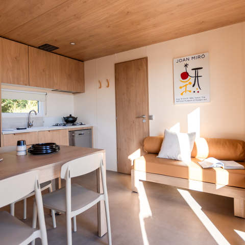 Wohnzimmer mit Essbereich und Elektroheizung in allen Zimmern. Flachbildfernseher und WLAN.