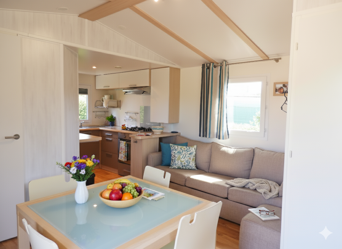 Gemachte Betten bei Ihrer Ankunft in der Unterkunft, vom Campingplatz übernommene Endreinigung, bereitgestellte Haushaltswäsche, Vermietung von Ausrüstungen...