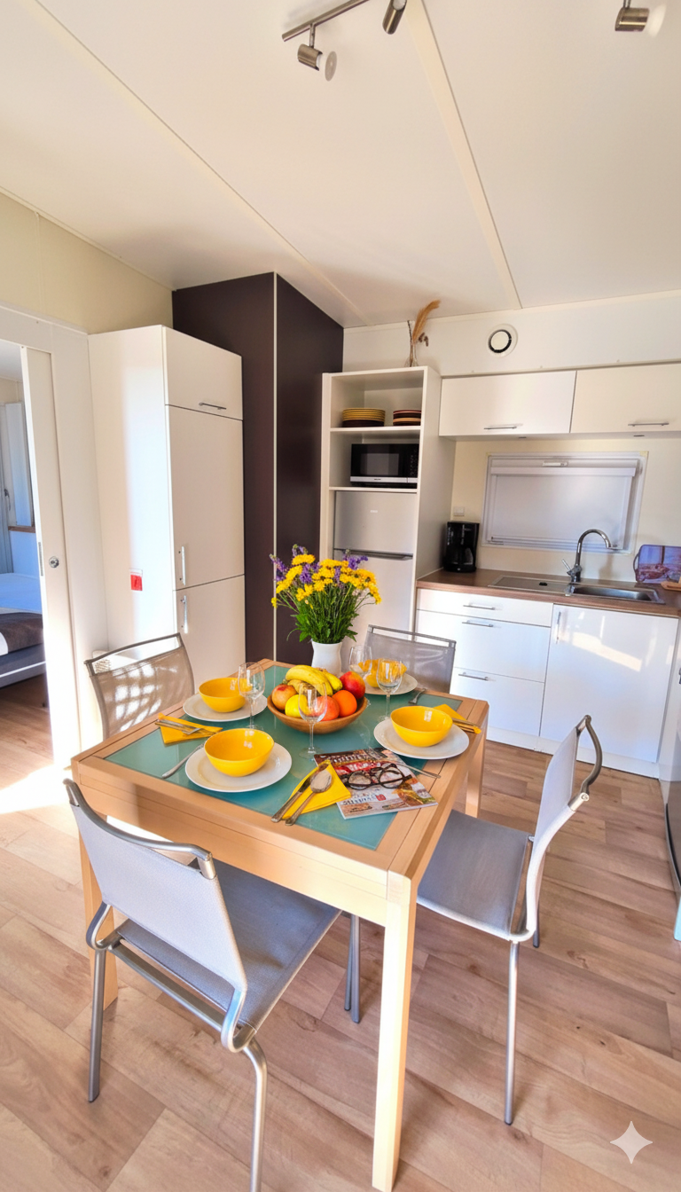 Gemachte Betten bei Ihrer Ankunft in der Unterkunft, vom Campingplatz übernommene Endreinigung, bereitgestellte Haushaltswäsche, Vermietung von Ausrüstungen...