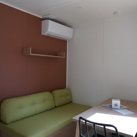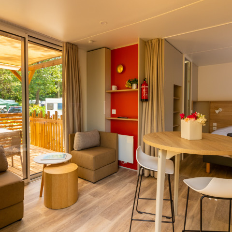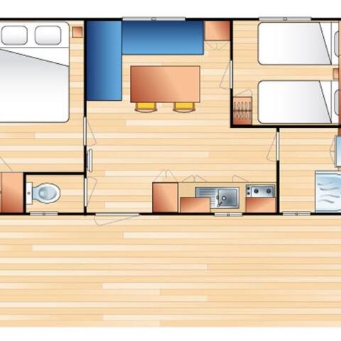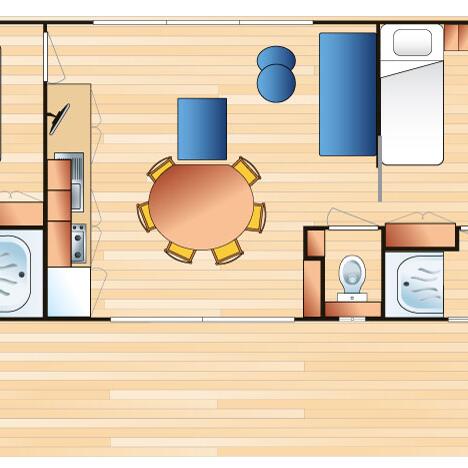 - Die Mobilheime der Komfortklasse bieten eine Fläche von 25 bis 32 m². Sie verfügen über zwei oder drei Zimmer und sind für zwei bis sieben Personen ausgelegt. Sie sind möbliert und ausgestattet und bieten einen komfortablen Wohnraum sowie eine überdachte Terrasse!