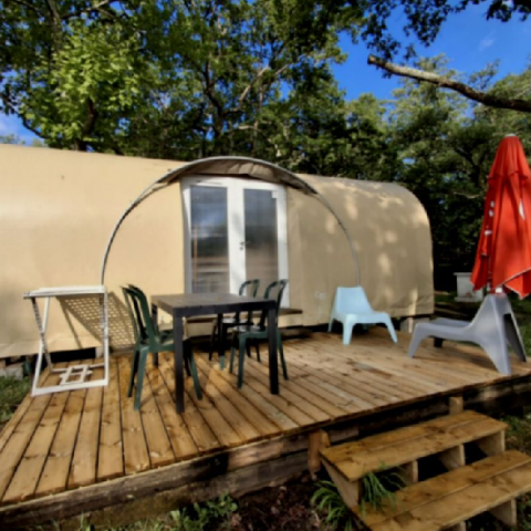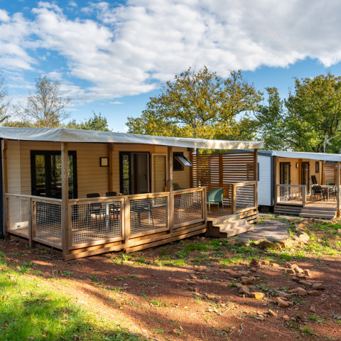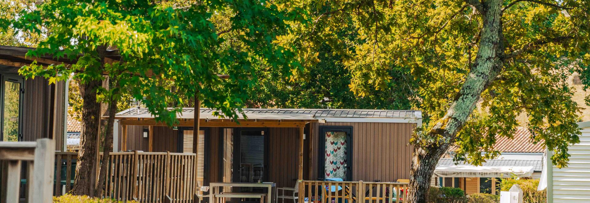 Inmitten der Eichen und in einer Hügellandschaft gelegen, versetzen Sie die komplett aus Holz gebauten Chalets mitten in die Natur. Auf den mit Sonnenliegenausgestatteten Holz-Terrassen können Sie sich so richtig entspannen.