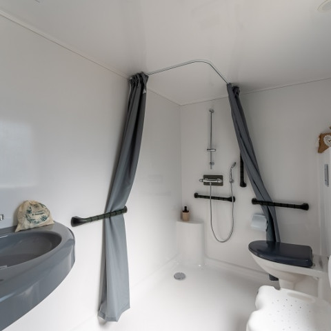 Genießen Sie bei Ihrer Auszeit in Südfrankreich ihre komfortable Ausstattung: Duschen mit Warmwasser, doppeltes Spülbecken, WC, Spiegel, Regalbretter und Steckdosen.