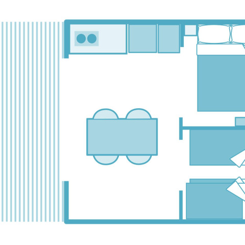 Der Wohnbereich mit ausgestatteter Kochnische lädt zu geselligem Beisammensein mit der ganzen Familie auf der eingerichteten Terrasse ein. Diese Zelt-Mietunterkunft verfügt nicht über Sanitäranlagen, sodass Sie ein 100 % traditionelles Campingerlebnis erwartet.