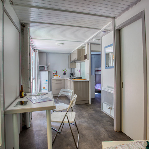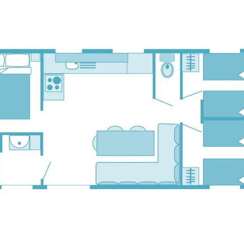 Sie ist mit getrennten Bereichen ausgestattet und verfügt über ein Elternzimmer mit Doppelbett sowie ein Kinderzimmer mit Etagenbett.