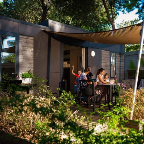 Wie auch immer Ihre Gruppe aussieht, wir haben die passende Unterkunft für Sie. Das Mobilheim Sunêlia Prestige Taos zum Beispiel, mit seinen zwei separaten Schlafzimmern, eines davon mit Elternsuite. Es ist klimatisiert, mit einem Fernseher und einer Plancha ausgestattet und bietet einen angenehmen Aufenthalt im Inneren und im Freien. In einem ruhigen und erholsamen Ambiente gelegen, fügt sich sein modernes Design harmonisch in die baumreiche Umgebung ein. Umgebung ein.