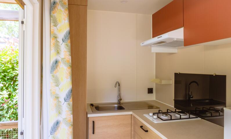 Eingebettet in eine grüne Oase ist das Sunêlia Prestige Oranger der perfekte Rückzugsort für alle, die von einem entspannten Urlaub zu zweit träumen. Dieses Mobilheim der neuen Generation bietet eine clever gestaltete Fläche von 17,8 m², bei der jedes Detail darauf ausgerichtet ist, eine gemütliche und moderne Atmosphäre zu schaffen.