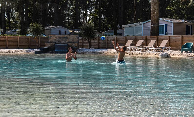 Um ein paar Bahnen zu ziehen, ein bisschen zu planschen oder eine Partie Wasserpolo zu spielen, ist der Aquapark des Sunêlia-Campingplatzes Le Petit Bois der richtige Treffpunkt im Urlaub. Gleich nach der Öffnung des Campingplatzes können Sie sich in unserem auf 28 °C beheizten Innenbecken mit Wellness-Ecke entspannen. Ab dem Himmelfahrtswochenende besteht die Möglichkeit, in unserem auf 28 °C beheizten Außenbecken mit Wellnessbereich, Geysiren und Wasserfall zu baden. Nutzen Sie für Rutschpartien bei Spaß und guter Laune unsere 3 Wasserrutschen mit separatem Auffangbecken. Die Jüngsten können sich im Planschbecken erfrischen und sich mit den Freuden des Wassers vertraut machen. Gleich daneben werden Sie wahrscheinlich dem Charme der türkisblauen Süßwasserlagune erliegen. Der weiße Sand und die geringe Tiefe garantieren Ihnen innere Ruhe. Die Sonne des Départements Loire-Atlantique kümmert sich darum, das Wasser zu wärmen, das auf natürliche Art aufbereitet wird.