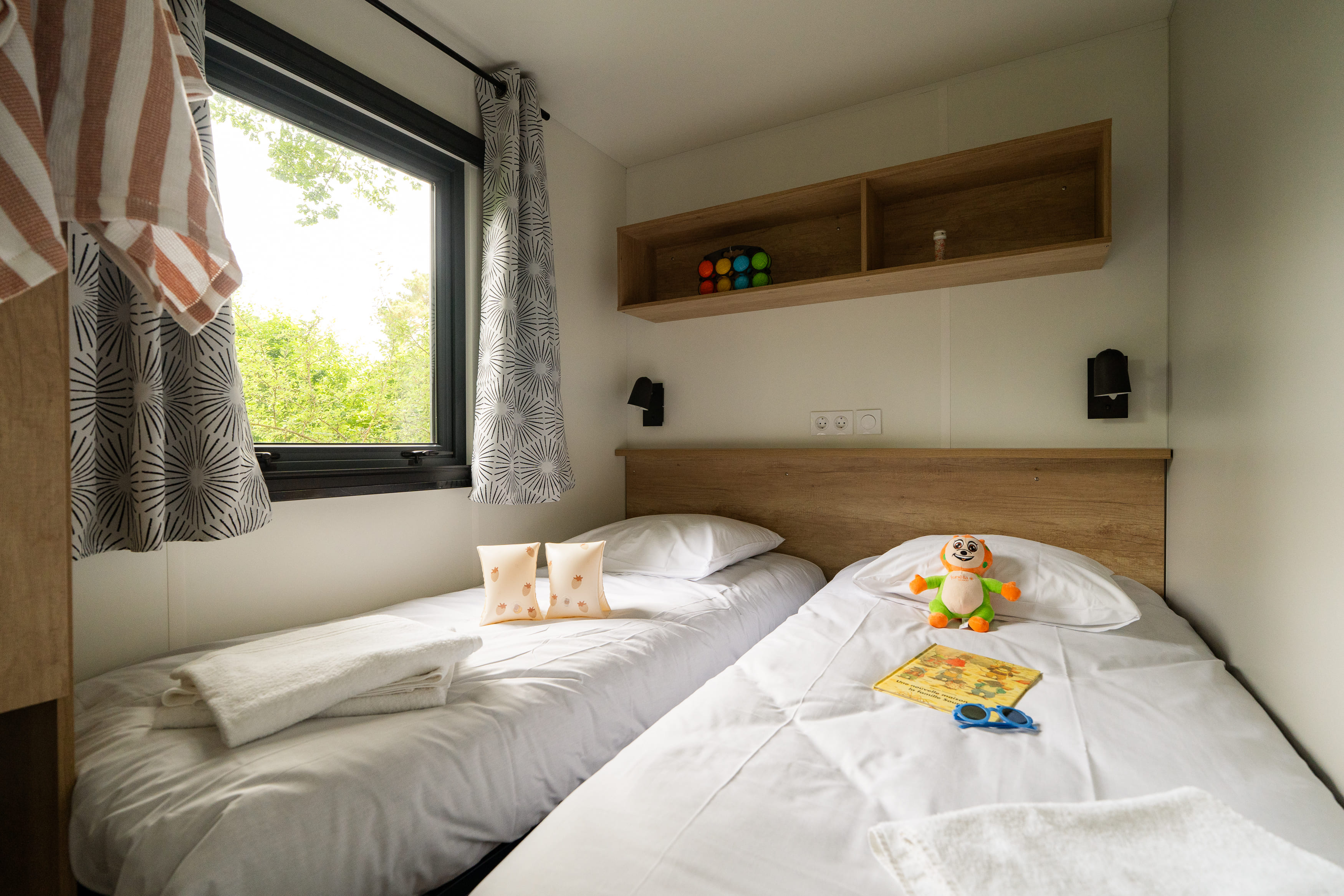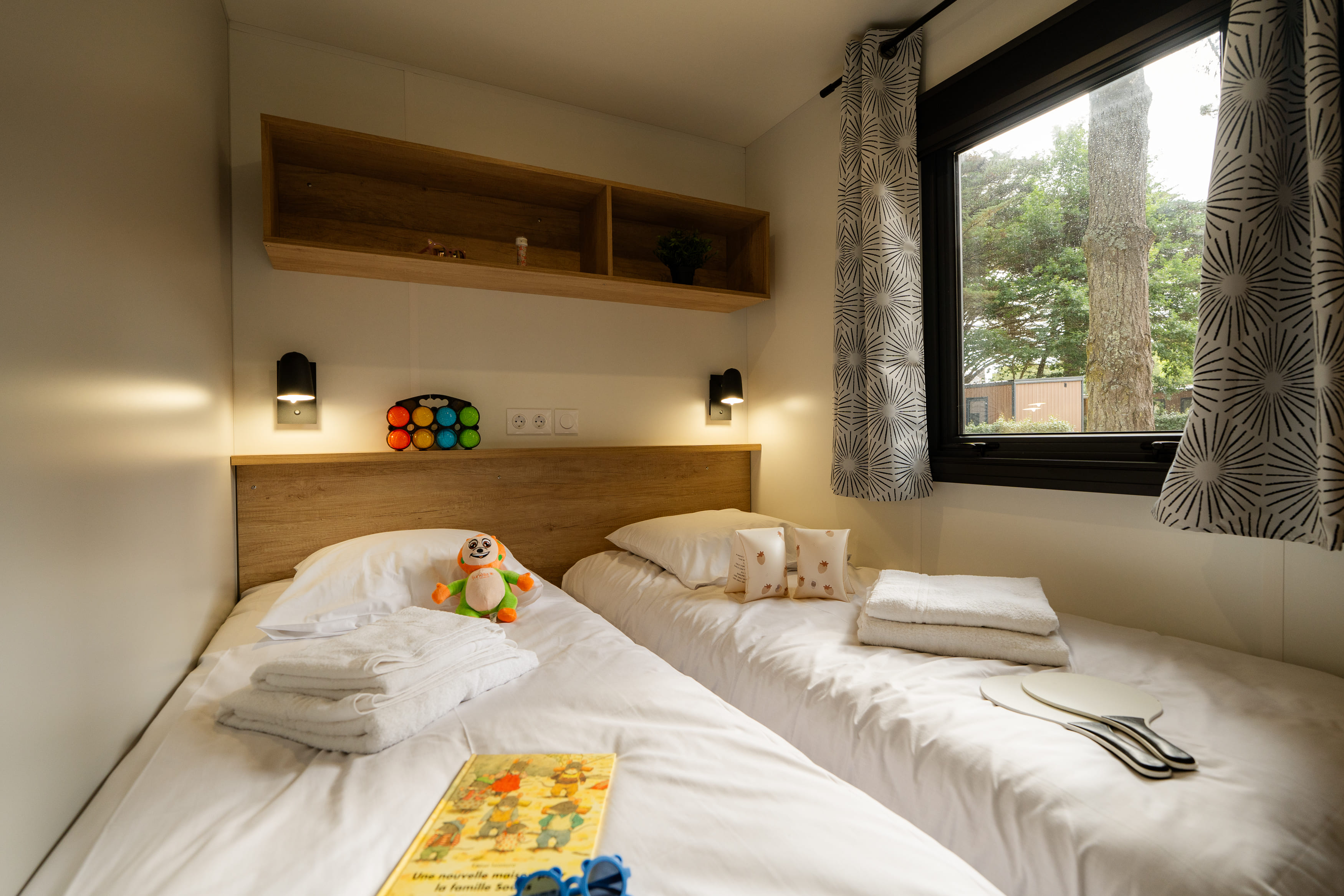 La suite parentale offre un lit en 160x200, entouré de confort. Les deux autres chambres accueillent les enfants avec des lits en 80x190. Les combi-stores occultant moustiquaire dans les chambres ajoutent une note de confort pour des nuits paisibles.