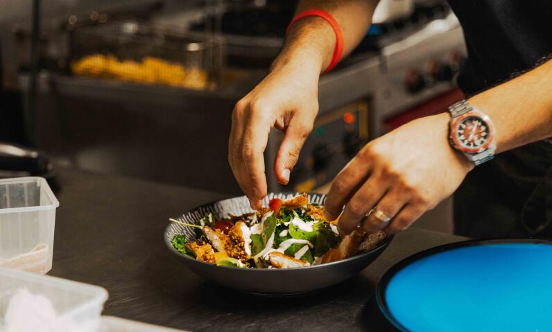 Genießen Sie frische Salate der Saison, Pizza, Brathähnchen, Hamburger, Paninis, Crêpes, Waffeln und andere süße Köstlichkeiten.