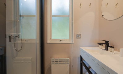 1. Hauptbadezimmer: Dusche, Waschbecken und WC.