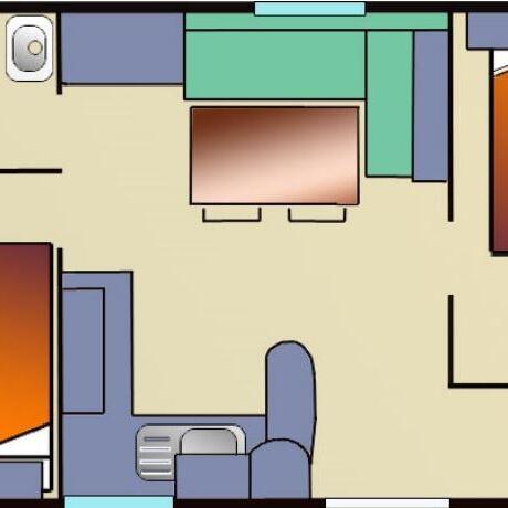 Sunelia Prestige Chalet 2 Schlafzimmer (35m²), ein Schlafzimmer mit 1 Doppelbett (160 x 200), ein Schlafzimmer mit 3 Einzelbetten (80 x 190) (1 Einzelbett, 1 Etagenbett und 1 Rollbett). Wohnzimmer mit Sofa, Flachbildschirm-TV und Klimaanlage. Voll ausgestattete Küchenzeile mit Kühl-/Gefrierschrank, Toaster, Senseo- und Filterkaffeemaschine, Wasserkocher, Geschirrspüler und Mikrowelle. Badezimmer (Dusche, Waschbecken), separates WC. Überdachte Holzterrasse mit Möbeln, 2 Liegestühlen, Jacuzzi und Plancha.