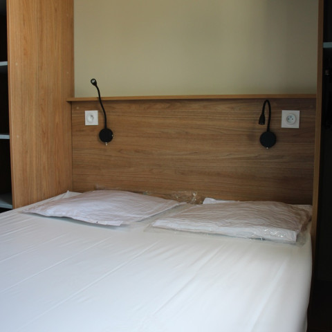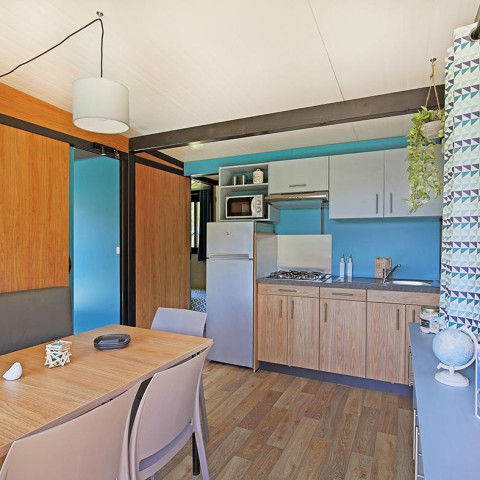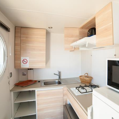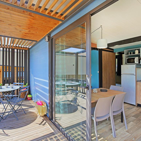 Ebenfalls für Entspannung mit der Familie sorgt das Modell Cottage Prestige „Espace Mer“. Mit seinem Komfort- und Ausstattungsniveau erstreckt es sich auf eine Fläche von 40 m2. Dieses geräumige, gut eingeteilte Mobilheim bietet eine ausgestattete Küche sowie eine schattige Terrasse mit Meeresblick. Nutzen Sie außerdem den freien Zutritt zum Spa des 4-Sterne-Campingplatzes.