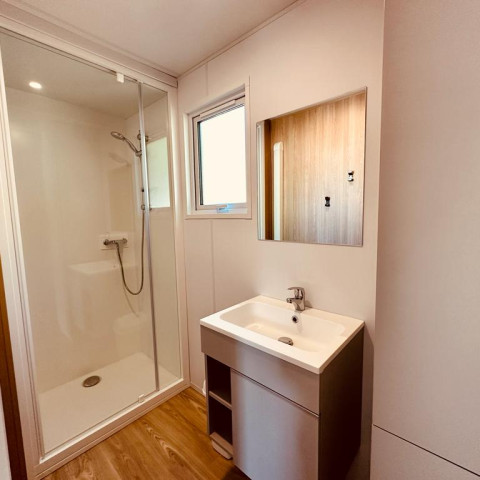 Das klimatisierte Mobilheim verfügt über zwei Schlafzimmer (ein Schlafzimmer mit einem 140 x 190 cm großen Doppelbett und ein Schlafzimmer mit zwei 80 x 190 cm großen Einzelbetten), eine voll ausgestattete Küchenzeile, ein Wohnzimmer mit Ecksofa, Klimaanlage, ein Duschbad und ein separates WC.