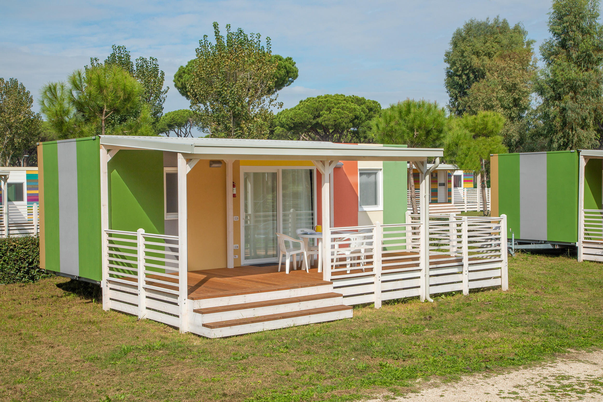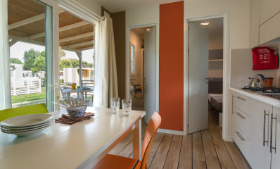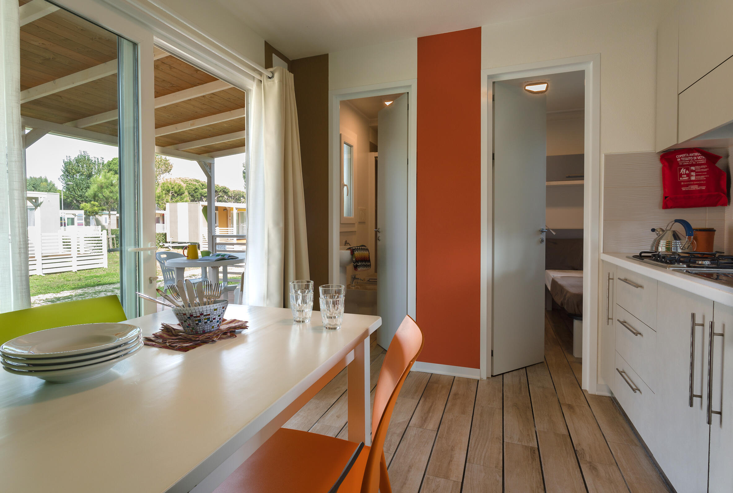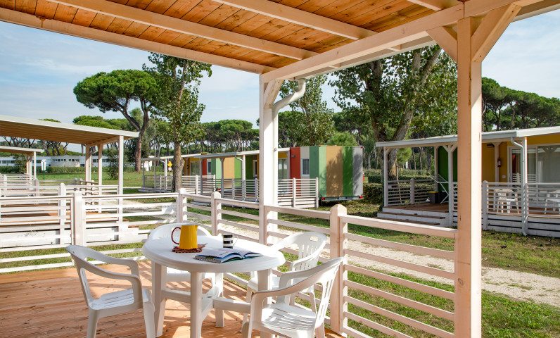 Die Baia Tevere, ca.24mq, hat Platz für höchstens 4 Personen. Es gibt 1 Schlafzimmer mit Doppelbett und 1 mit 2 Einzelbetten. Das Wohnzimmer hat Tisch und Stühlen, einer Kochnische mit Kühlschrank und Kochfeld und das Badezimmer hat Dusche, Waschbecken und WC. Inbegriffen sind Geschirr, Bettzeug und Kissen. Draußen gibt es eine überdachte Holzveranda mit Tisch und Stühlen.