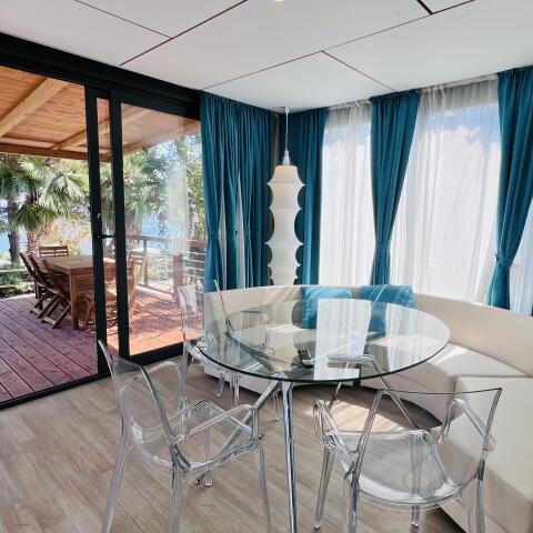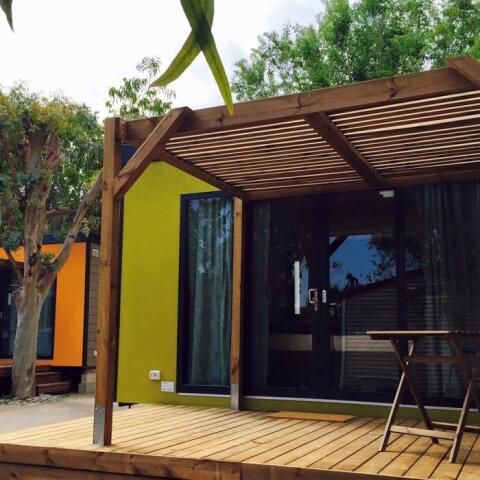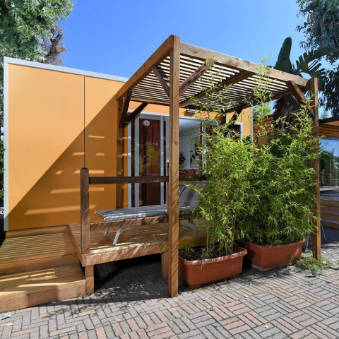 Genießen Sie den Komfort dieser klimatisierten Mobilheime und gönnen Sie sich ein paar wohlverdiente Momente süßen Nichtstuns auf der möblierten Terrasse.