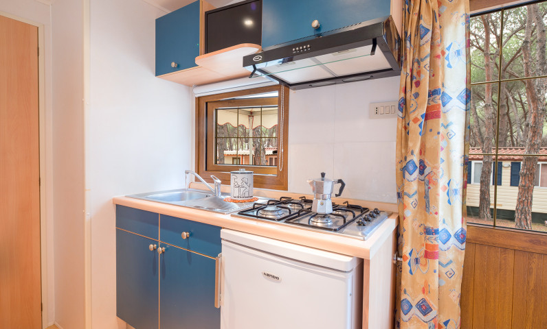 Baia Comfort: In this mobile home can sleep up to a maximum of 4 persons and consists of two bedrooms and 2 bathrooms: one double bed room with a small bathroom (sink and toilet), one bedroom with 2 single beds (they are not joinable and they are not suitable for people of average height), second bathroom with toilet, shower and sink, dining room with table and sofa, kitchenette with sink and fridge. Wood terrace with table and chairs outside.