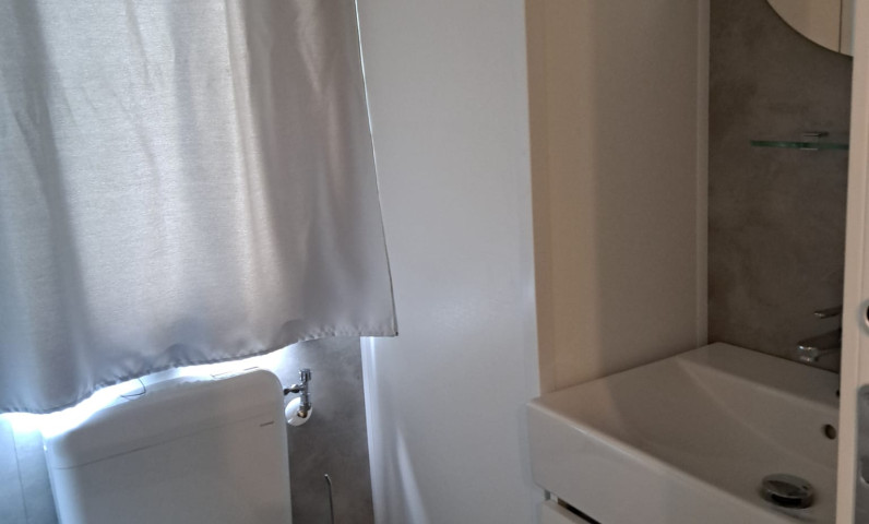 Mobile Home Baia Elite with an area of about 33 mq is designed to host families of up to 6 people. The interior furnishings are modern and comfortable: a corner kitchen with a peninsula (peninsula present only in some accomodation) , complete with a 4-burner gas cooker, sink, pots and pans, column fridge with freezer. The large French window, which overlooks the spacious wooden veranda gives brightness to the large living room, furnished with a modern sofa, table and chairs. To complete the accommodation, a sleeping area with 3 bedrooms, one with a double bed and 2 with 2 single beds, a complete bathroom with toilet, shower, sink and 1 bathroom with WC and washbasin.