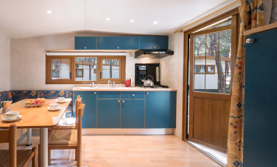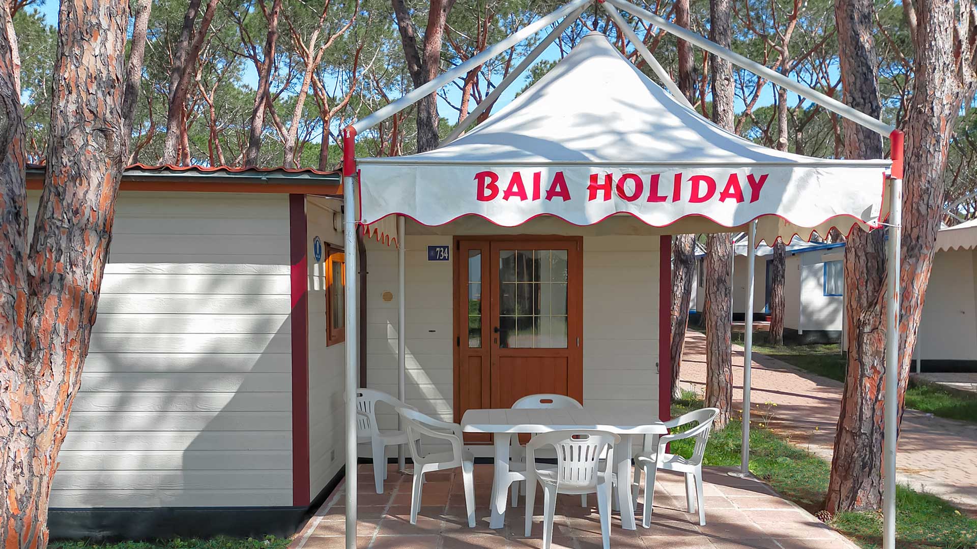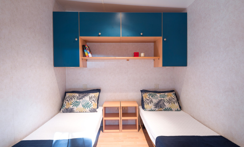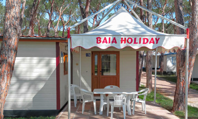 Baia Lux It has an area of approximately 31 square meters and can sleep a maximum of 4 adults . It comprises a double bedroom, a bedroom with two single beds (may be joined), a bathroom with toilet, shower, bidet, washbasin, hair dryer and towels warmer, living room with dining table, chairs and sofa, kitchenette with sink and refrigerator. Outside you can find a sun umbrella, sun beds, clothes airer, table and chairs. The mobile home includes satellite TV, cutlery, crockery, blankets and pillows.
