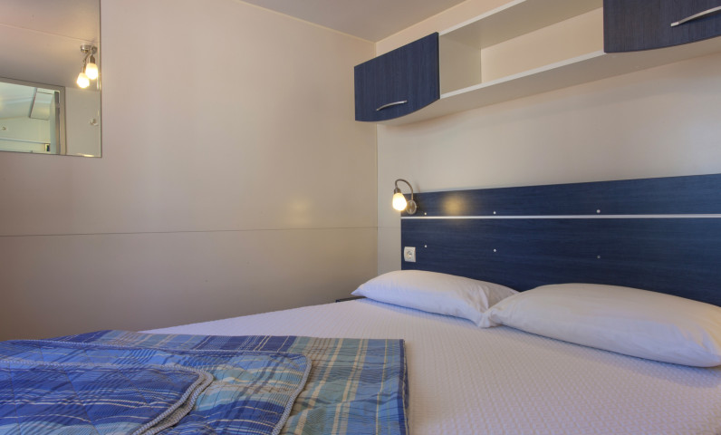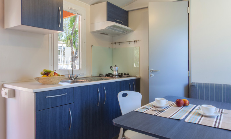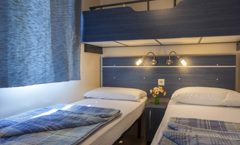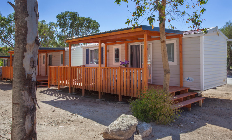 Es ist ca. 24 qm groß und kann maximal 4 Erwachsenen und 1 Kind aufnehmen. Es besteht aus einem Zimmer mit Doppelbett, einem Zimmer mit zwei Einzelbetten und einem dritten Etagenbett Wohnküche, Tisch und Stühle, ein Bad mit WC, bidet, Dusche und Waschbecken, Kochnische mit Spülbecken und Kühlschrank. Im Mobilhaus mit inbegriffen sind Geschirr und Besteck, Decken und Kissen, Gartentisch und Stühle. Klimaanlage ist gegen Aufpreis erhältlich