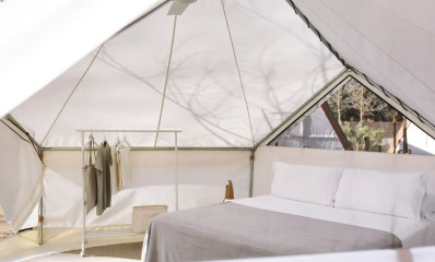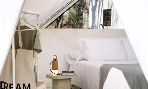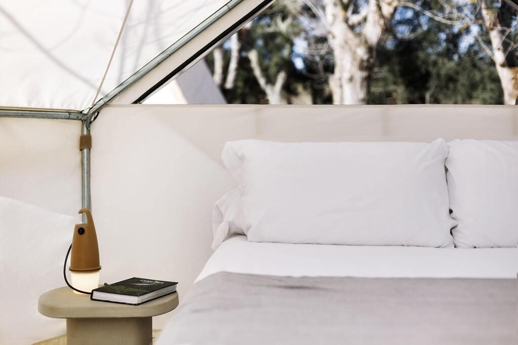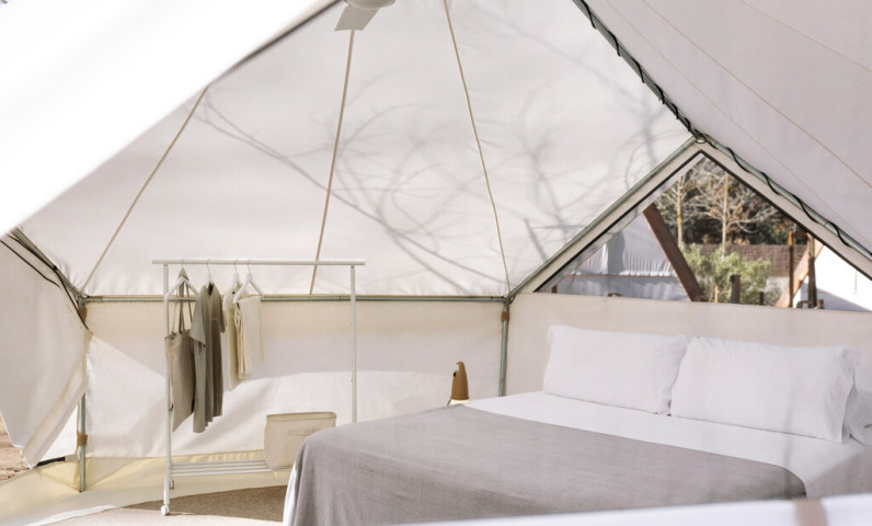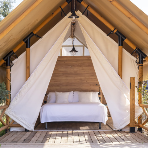 Unser Bell Tent ist ideal für Paare, die auf dem Campingplatz inmitten der Natur etwas anderes suchen, mit einem Hauch von Luxus. Es verfügt weder über eine Küche noch ein eigenes Bad, aber die öffentlichen Toiletten sind nur wenige Meter vom Zelt entfernt. Das Beste an ihm? Es verfügt über ein bequemes Doppelbett, einen Minikühlschrank, Küchenutensilien und eine Mikrowelle.