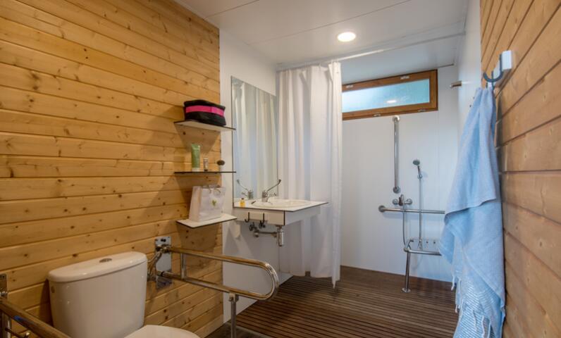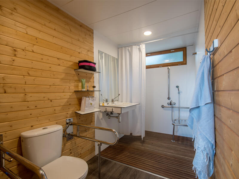 Ein Badezimmer, das für Menschen mit eingeschränkter Mobilität geeignet ist (Dusche mit Sitz, Waschbecken und Toilette mit Haltegriffen).