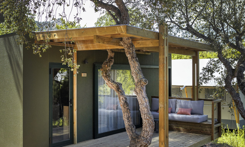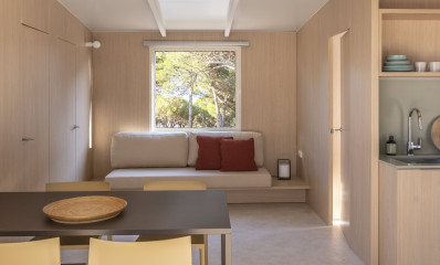 Die Family Mobile Home + sind die von uns konzipierten und gestalteten Unterkünfte für Ihren Urlaub mit Ihrer Familie oder einer Gruppe von Freunden bis zu 5 Personen. Es ist ein neues Mobilheim mit einer detaillierten und geräumigen Innenausstattung. Es ist ein Mobilheim mit zwei Schlafzimmern, eines mit einem Doppelbett und das andere mit zwei Einzelbetten. Es hat auch eine Terrasse mit einer möblierten, schattigen Veranda. Ausgestattet mit Küche mit Herd, Mikrowelle, Kühlschrank, Kochutensilien und Besteck. Sie verfügen über ein Badezimmer mit einer kleinen Badewanne, Dusche und WC.