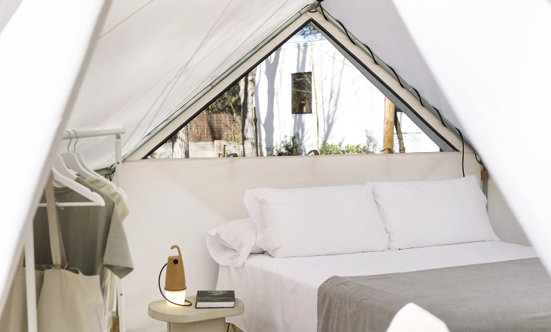 Unser Bell Tent ist ideal für Paare, die auf dem Campingplatz inmitten der Natur etwas anderes suchen, mit einem Hauch von Luxus. Es verfügt weder über eine Küche noch ein eigenes Bad, aber die öffentlichen Toiletten sind nur wenige Meter vom Zelt entfernt. Das Beste an ihm? Es verfügt über ein bequemes Doppelbett, einen Minikühlschrank, Küchenutensilien und eine Mikrowelle.