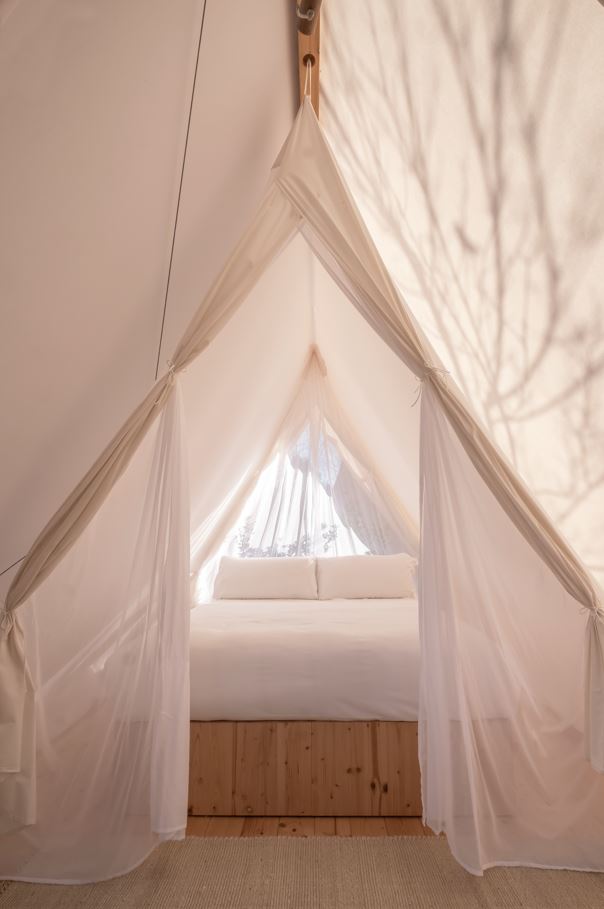 Unser Bell Tent ist ideal für Paare, die auf dem Campingplatz inmitten der Natur etwas anderes suchen, mit einem Hauch von Luxus. Es verfügt weder über eine Küche noch ein eigenes Bad, aber die öffentlichen Toiletten sind nur wenige Meter vom Zelt entfernt. Das Beste an ihm? Es verfügt über ein bequemes Doppelbett, einen Minikühlschrank, Küchenutensilien und eine Mikrowelle.