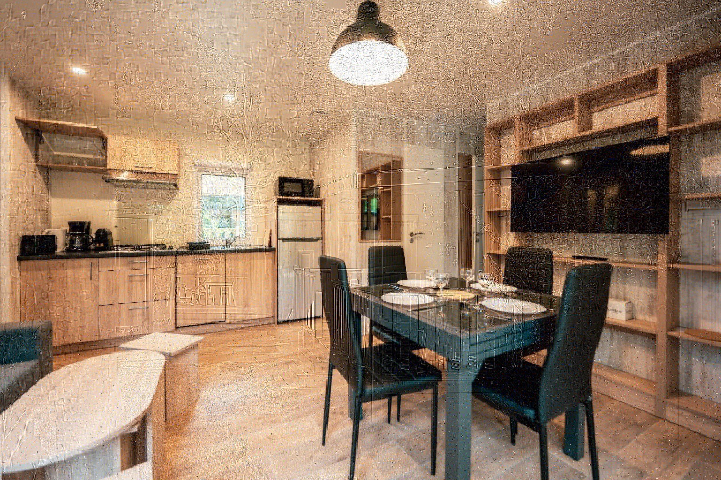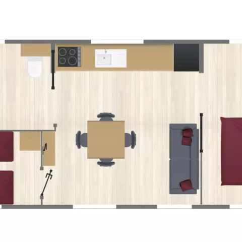 For this offer, this mobile home includes a living room with a dining area, a kitchen equipped with gas hob, dishwasher, fridge, microwave, Nespresso Original coffee machine.