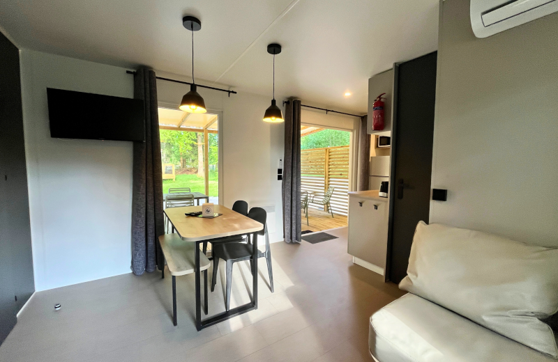 Inside, natural light and warm materials create a soothing atmosphere. The living area includes a fully equipped kitchen opening onto the lounge, a comfortable shower room, and thoughtfully arranged sleeping spaces to ensure restful nights before your activities.
