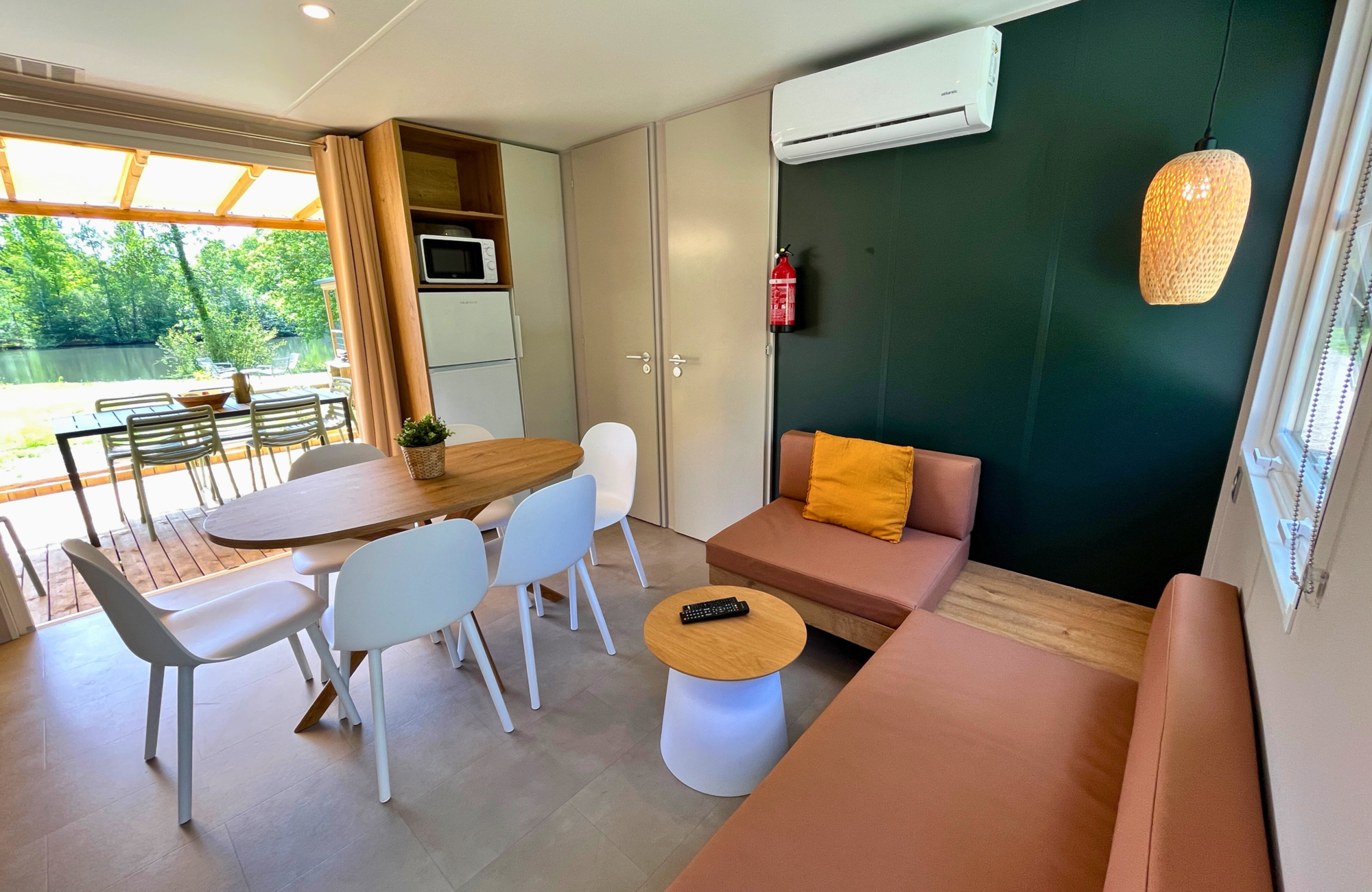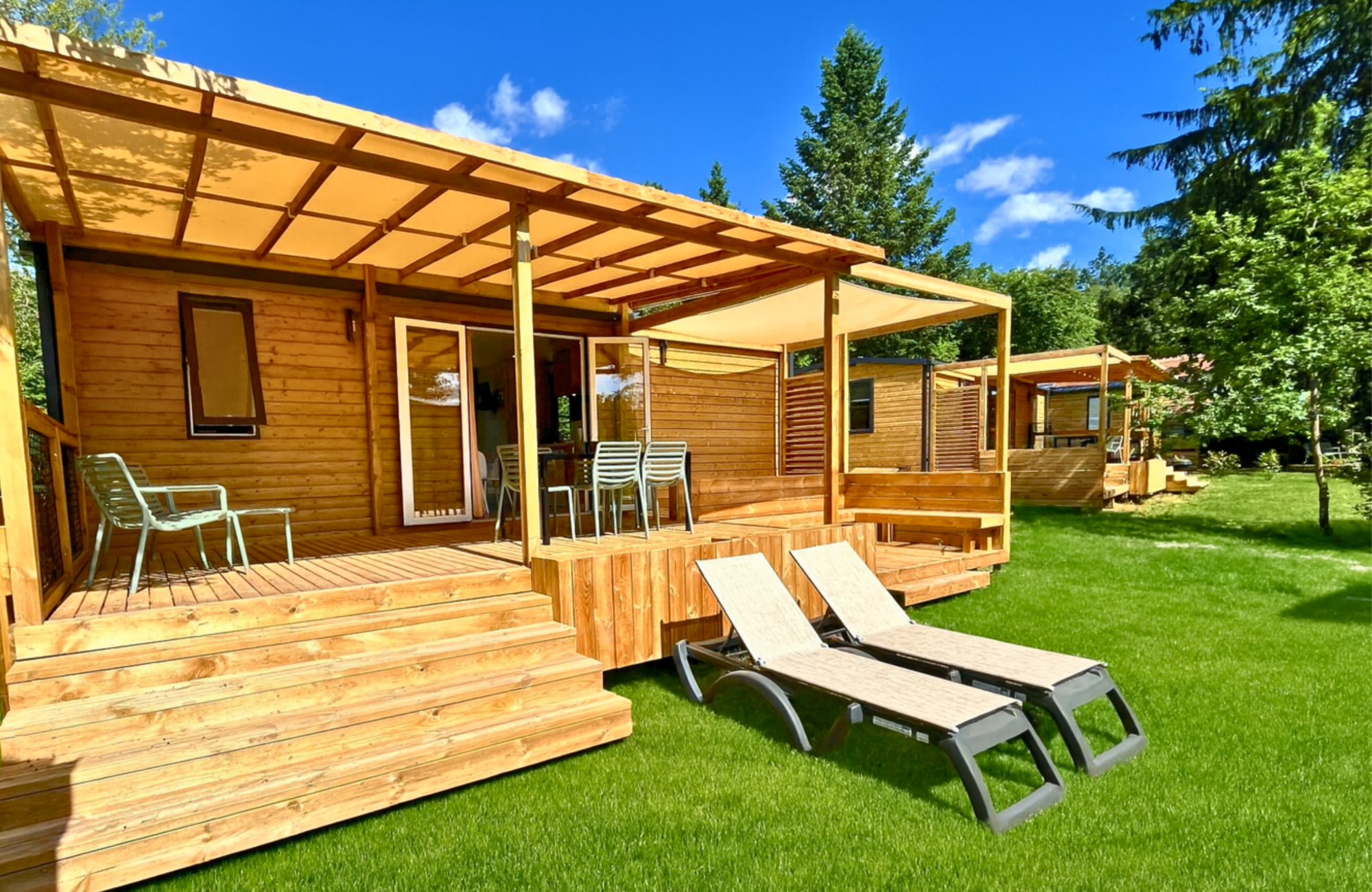 Inside, natural light and the scent of wood create a warm and inviting atmosphere. You’ll find a fully equipped kitchen opening onto the living area, a spacious shower room, and comfortable bedrooms for restful nights before your next day’s activities.