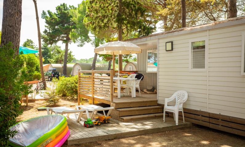 Set in the shade of the pine trees, Sunêlia CONFORT PINEDE is a perfect blend of aesthetics and comfort. With 25 m², 2 separate bedrooms, one with a 140 x 190 bed and the other with two 80 x 190 single beds. For once, the cot* has its place in the parents' bedroom. The kitchen and living room open onto a 10 m² semi-open terrace, providing additional outdoor living space whatever the weather. An additional wooden terrace has full garden furniture. Pets are accepted under our terms and conditions.