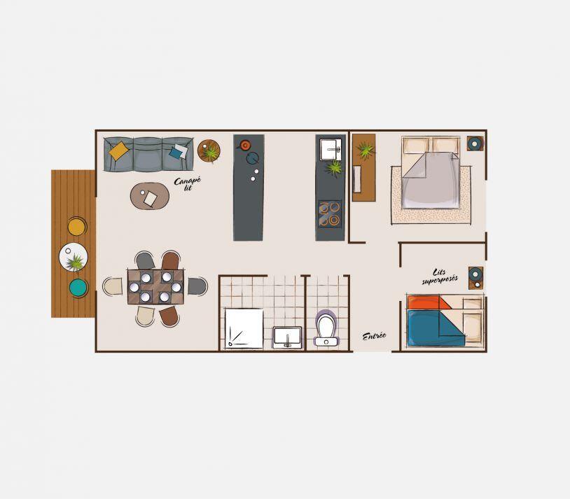 Living room with 1 single sofa bed and 1 single pull-out bed or double sofa bed. Bedroom with double bed. Bedroom with 2 bunk beds or bedroom with 1 single bed and mezzanine with 2 single beds. Shower room. Separate or integrated WC. Fully equipped kitchen with dishwasher, fridge, microwave/grill, coffee machine.
