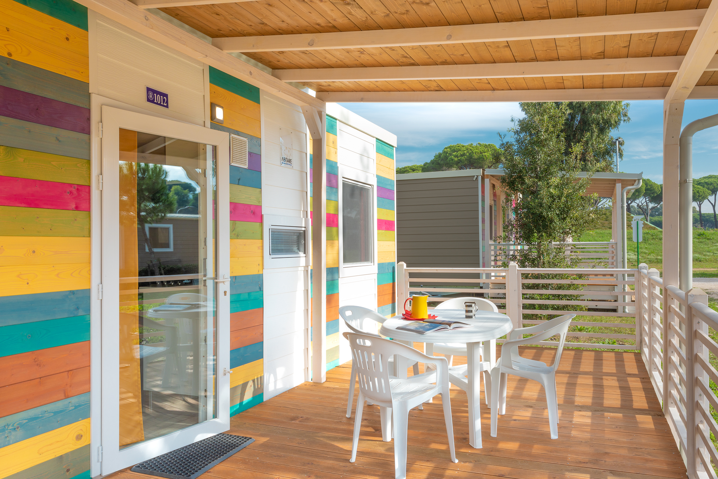 It has an area of approximately 24 sq.m. and can host maximum 4 adults. It composed of a bedroom with double bed, a bedroom with 2 single beds, a spacious living room with table and chairs, one bathroom with toilette, shower and sink, kitchenette with sink and refrigerator. The mobile home includes cutlery, crockery, blankets and pillows. Outside there is a covered wooden veranda with table and chairs.