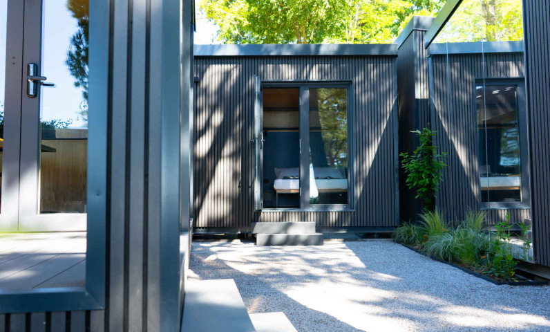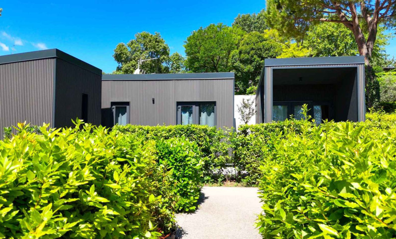 Fresh, young and cosy, the new LODGE is designed to accommodate a maximum of 7 people. A new concept whicht consists of 3 living modules: 2 sleeping areas and 1 kitchen area. The interior furnishings are modern and comfortable: a kitchen complete with table, chairs, a 4-burner hob, sink, pots, pans and crockery, and a column refrigerator complete with freezer. The large French window overlooking the spacious wooden veranda gives brightness to the large living room. The first module consists of a double bedroom with a bathroom, the second module has got a double bedroom, a bedroom with two single beds and a raised bed and a private bathroom; the kitchen is in the third module.
