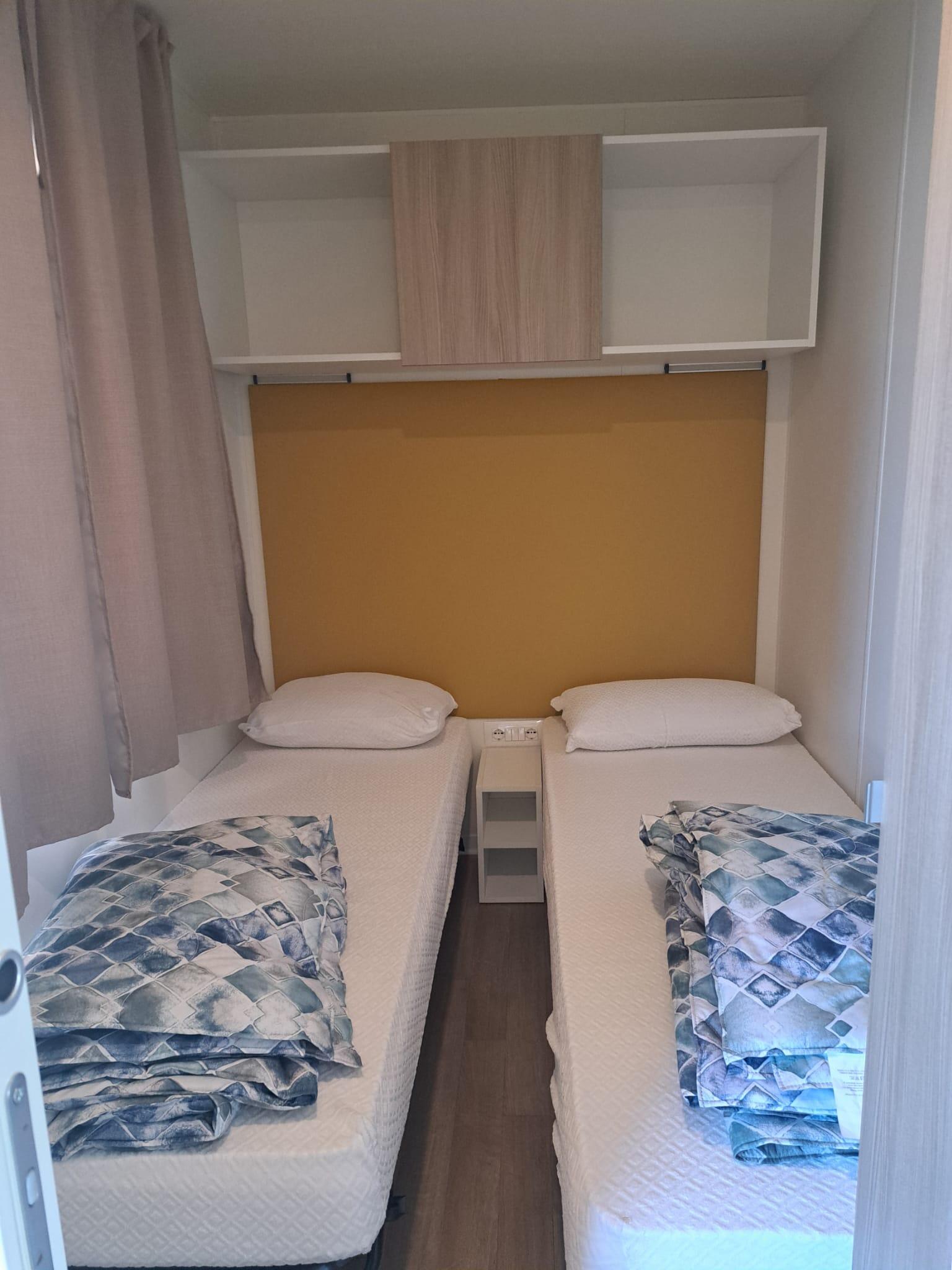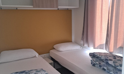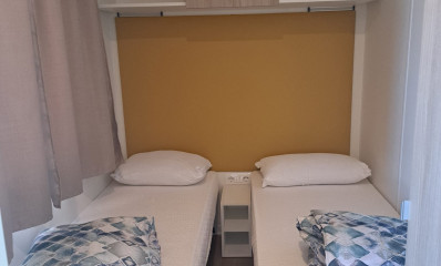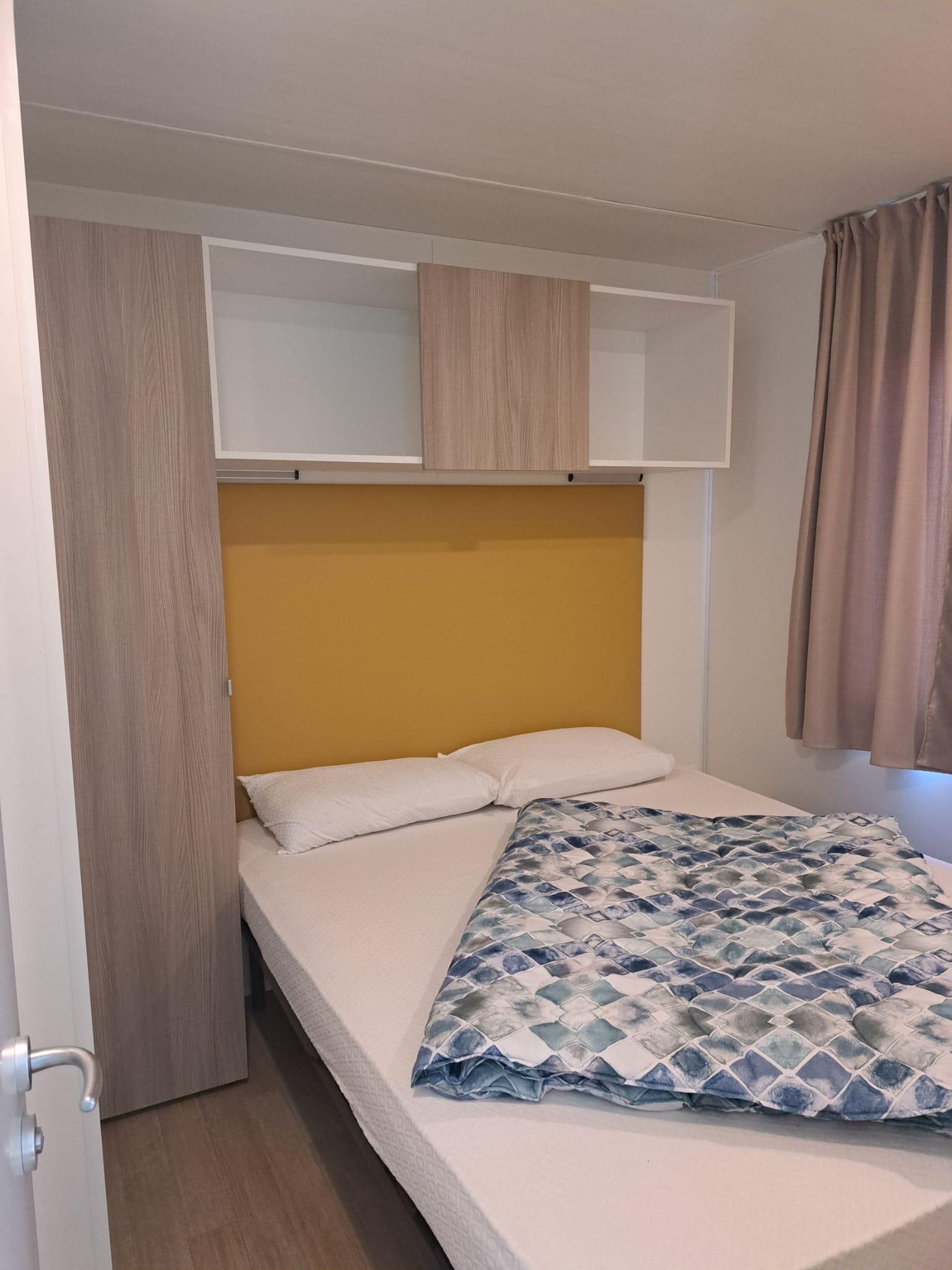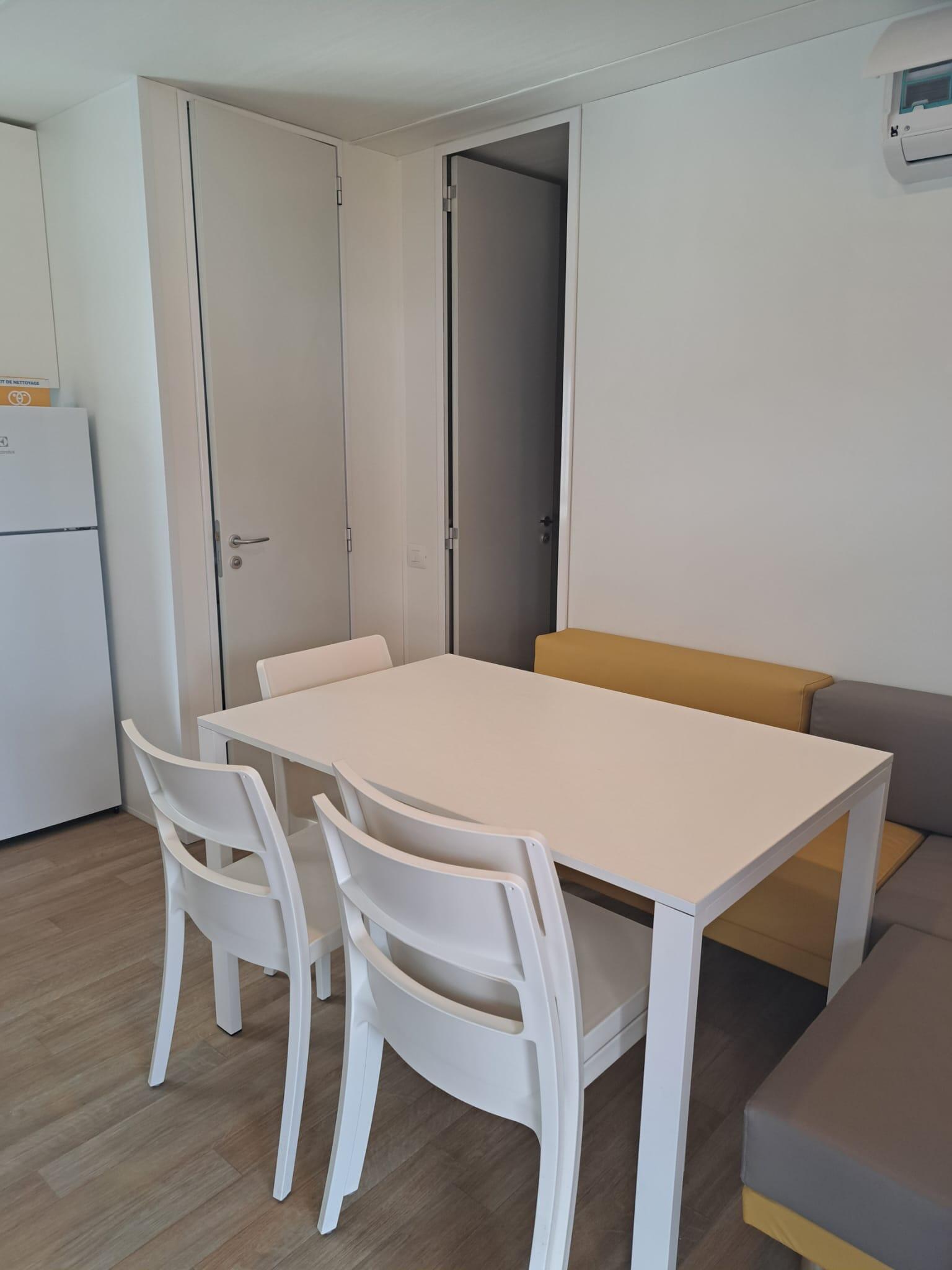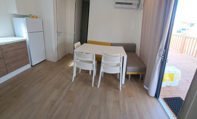 Mobile Home Baia Elite with an area of about 33 mq is designed to host families of up to 6 people. The interior furnishings are modern and comfortable: a corner kitchen with a peninsula (peninsula present only in some accomodation) , complete with a 4-burner gas cooker, sink, pots and pans, column fridge with freezer. The large French window, which overlooks the spacious wooden veranda gives brightness to the large living room, furnished with a modern sofa, table and chairs. To complete the accommodation, a sleeping area with 3 bedrooms, one with a double bed and 2 with 2 single beds, a complete bathroom with toilet, shower, sink and 1 bathroom with WC and washbasin.