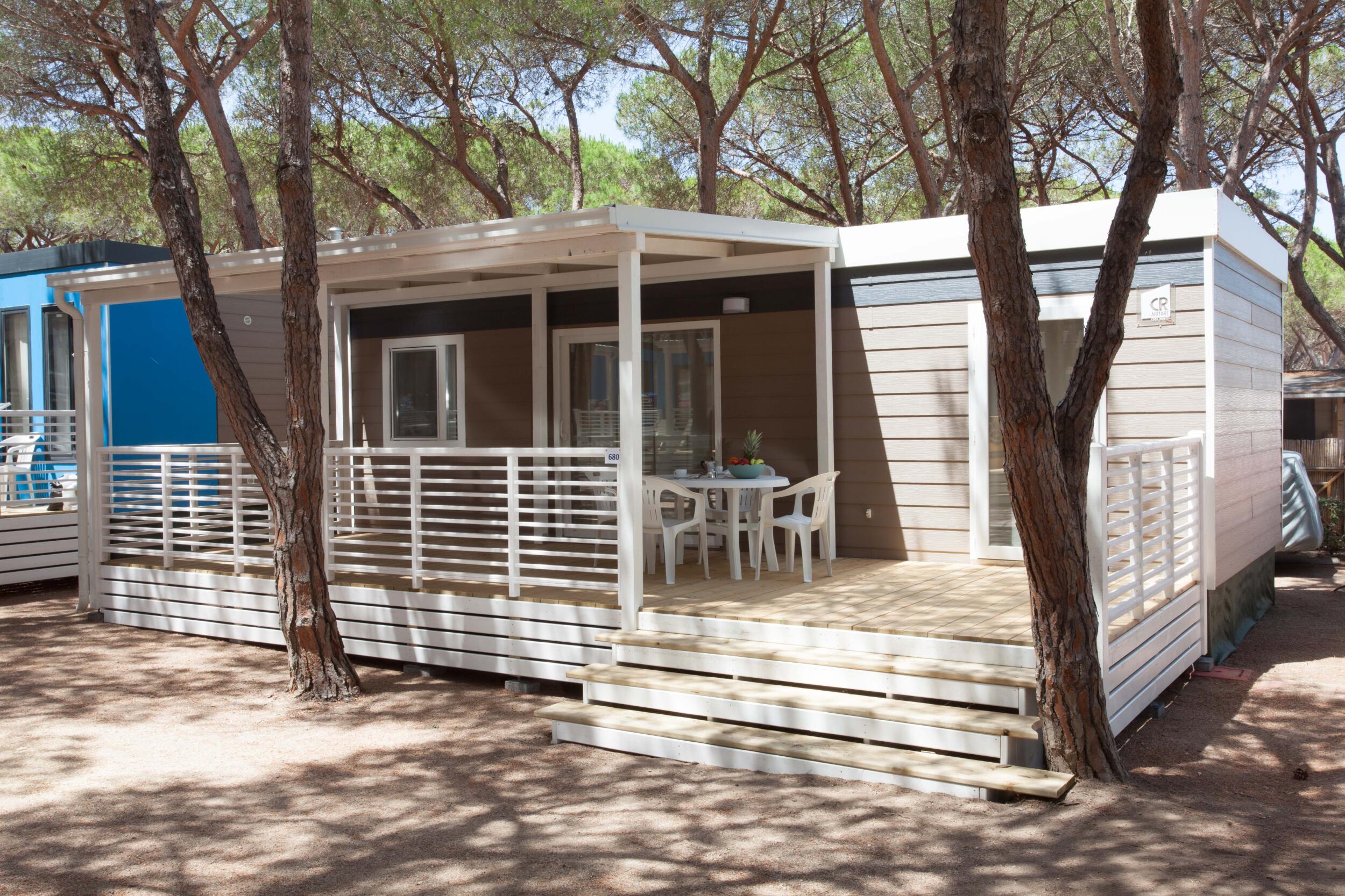 The Mobile Home Baia Elite with an area of about 33 sq.m. is designed to host families of up to 6 people. The interior furnishings are modern and comfortable: a corner kitchen with a peninsula (peninsula present only in some accomodation) , complete with a 4-burner gas cooker, sink, pots and pans, column fridge with freezer. The large French window, which overlooks the spacious wooden veranda gives brightness to the large living room, furnished with a modern sofa, table and chairs. To complete the accommodation, a sleeping area with 3 bedrooms, one with a double bed and 2 with 2 single beds, a complete bathroom with toilet, shower, sink and , in some units, a second bathroom with WC and washbasin.