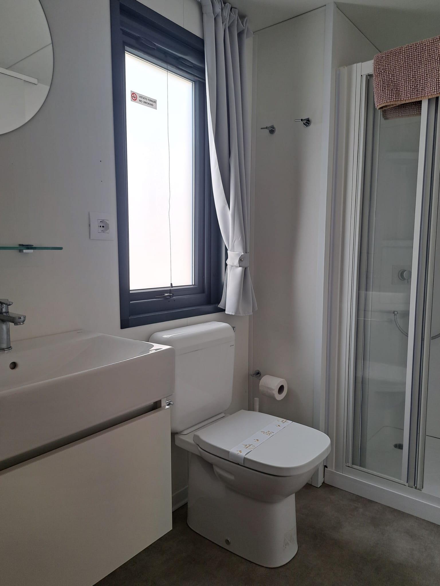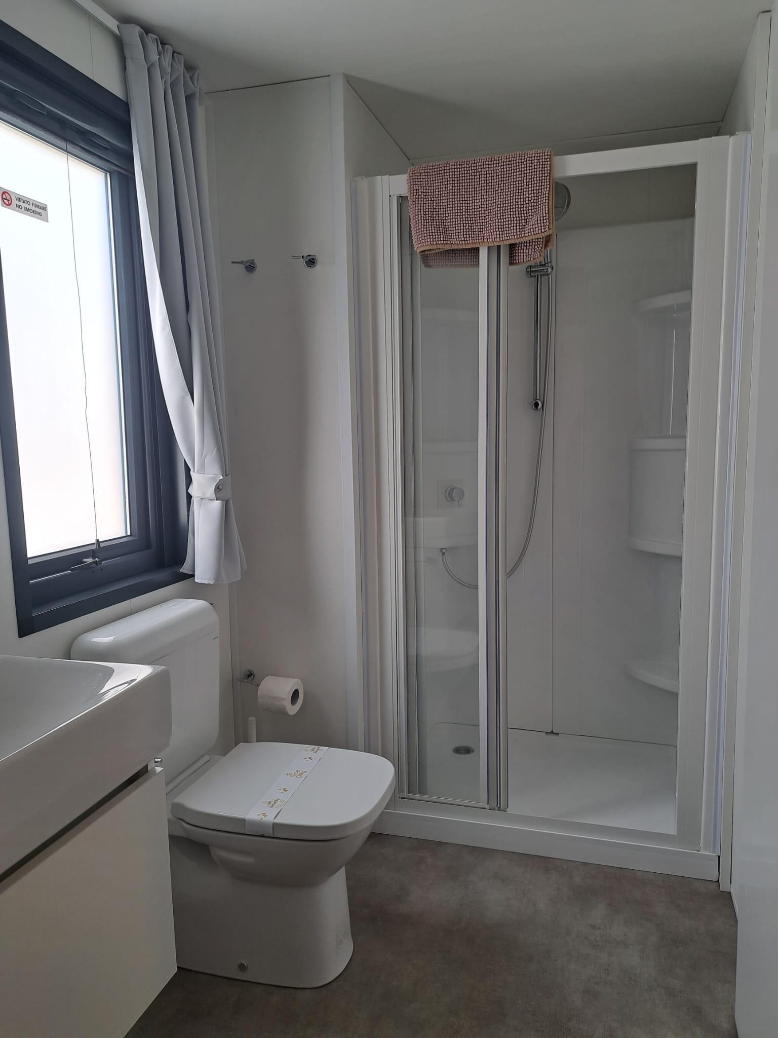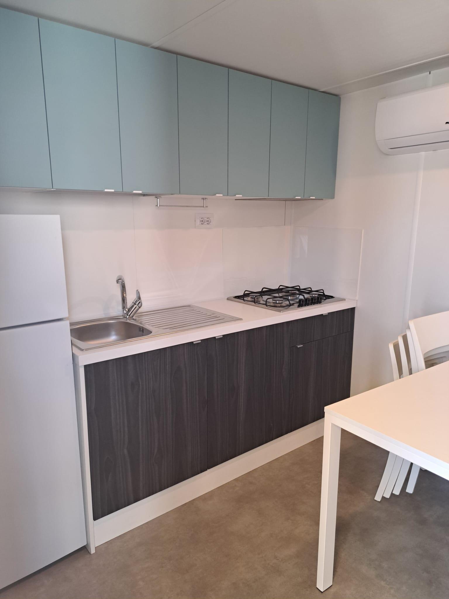 It has an area of 25mq and can hold up to 4 adults and one child. It is composed of a living room with table and chairs, a kitchenette equipped with a column fridge with a freezer, a 4-burner gas cooker, a sink, pots and pans and dishes. The sleeping area consists of 2 bedrooms, one with a double bed and one with 2 single beds. The accommodation has 1 complete bathroom with toilet, shower and sink .A covered wooden veranda equipped with table and chairs allows you to enjoy the outdoor spaces, typical of a holiday in nature.