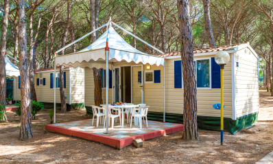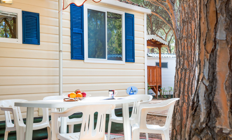 Blu Romantic It has an area of approximately 24 square meters and can sleep up to a maximum of 4 adults and 2 children. The price includes 4 adults. The cost for the additional child is €2.80 per day. Communicate the exact number of guests at the campsite. It is composed of a bedroom with double bed, a bedroom with 2 single beds (may be joined) and a third raised bed, living room with table, chairs and sofa bed, a bathroom with shower and basin, a bathroom with toilet and sink, kitchenette with sink and refrigerator. The mobile home includes satellite TV, cutlery, crockery, blankets and pillows. Air conditioning has to be paid extra (please check price list)