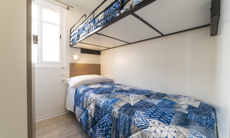 The new Baia Revolution with its 34 sq.m. is the ideal solution in order to host large families, up to 6 persons. It has modern and comfortable interiors: the living room is furnished with table and chairs, a comfortable sofa, a kitchenette equipped with a column fridge with freezer, a 4-burner gas cooker, sink, pots and pans. The sleeping area consists of 3 bedrooms, one with a double bed, one with 2 single beds and a bedroom with a bunk bed. The accommodation has 2 bathrooms complete with shower, sink, and toilet. A covered wooden veranda equipped with table and chairs allows you to enjoy the outdoor spaces, typical of a holiday in nature. Bring your four-legged friend with you: some units of this type are pet-friendly.