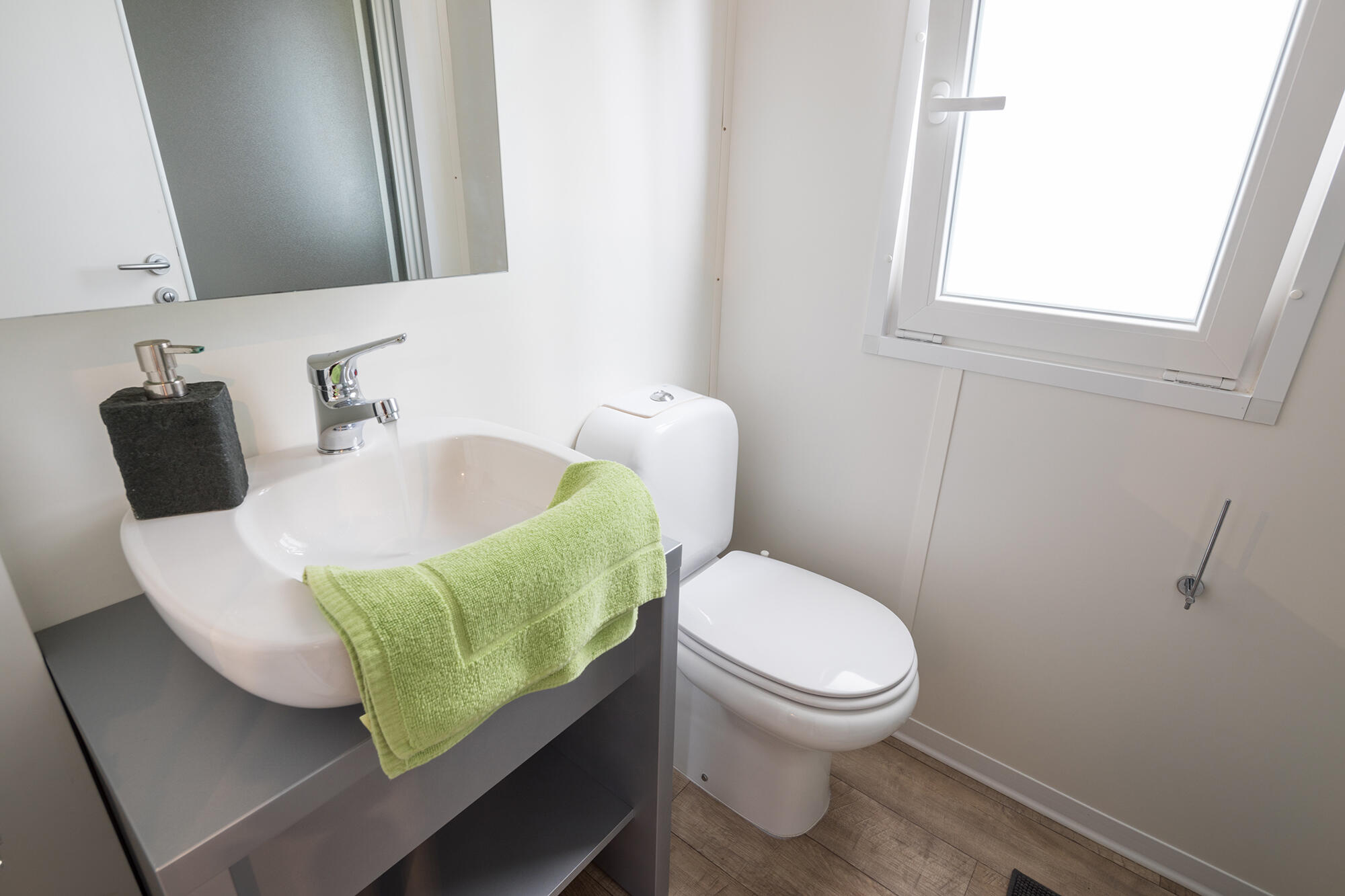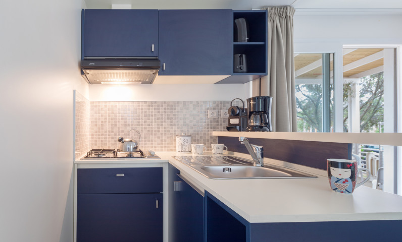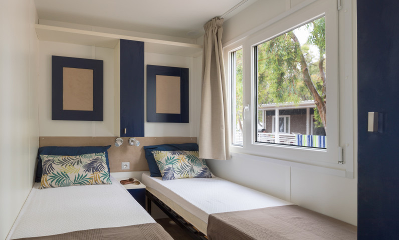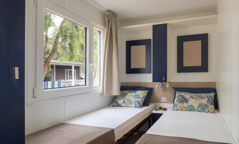 Fresh, young and welcoming, the Mobile Home Baia Elite with an area of about 33 sq.m. is designed to host families of up to 6 people. The interior furnishings are modern and comfortable: a corner kitchen with a peninsula (peninsula present only in some accomodation) , complete with a 4-burner gas cooker, sink, pots and pans, column fridge with freezer. The large French window, which overlooks the spacious wooden veranda gives brightness to the large living room, furnished with a modern sofa, table and chairs. To complete the accommodation, a sleeping area with 3 bedrooms, one with a double bed and 2 with 2 single beds, a complete bathroom with toilet, shower, sink and 1 bathroom with WC and washbasin. Bring your four-legged friend with you: some units of this type are pet-friendly. The beach service includes 2 sunbeds and 1 parasol