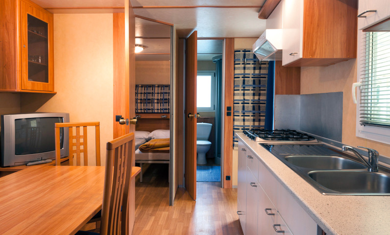 The Mobile Home Comfort are located in a private area, not far from the sea, completely immersed in the green of an English garden and in the cheerful color of oleanders. Perfectly isolated and functional, they have an area of about 22 sq.m. and can hold up to 4 adults. They consist of a living room with a table and corner seats set in a comfortable sofa, a kitchenette equipped with a fridge with icebox, a 4-burner hob, a sink, pots and pans and dishes. Complete the accommodation 2 bedrooms, one with a double bed and one with 2 single beds, 1 bathroom with toilet, shower and sink. Outside, a covered veranda extended to the entire length of the mobile home is the ideal place to enjoy an outdoor holiday.
