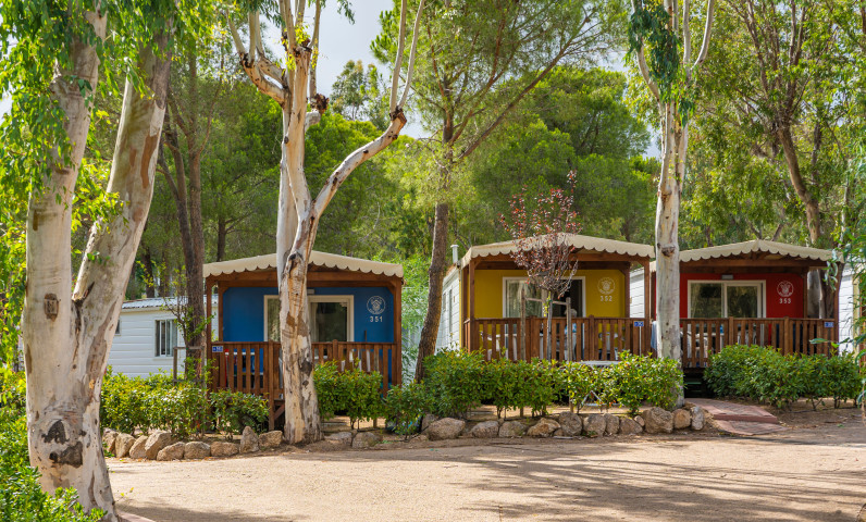 It has an area of 25 sq.m. and can hold up to 4 persons. It is composed of a living room with table and chairs, a kitchenette equipped with a column fridge with a freezer, a 4-burner gas cooker, a sink, pots and pans and dishes. The sleeping area consists of 2 bedrooms, one with a double bed and one with 2 single beds. Some units have 5 beds. The accommodation has 1 complete bathroom with toilet, shower and sink and 1 bathroom with WC and washbasin. A covered wooden veranda equipped with table and chairs allows you to enjoy the outdoor spaces, typical of a holiday in nature.