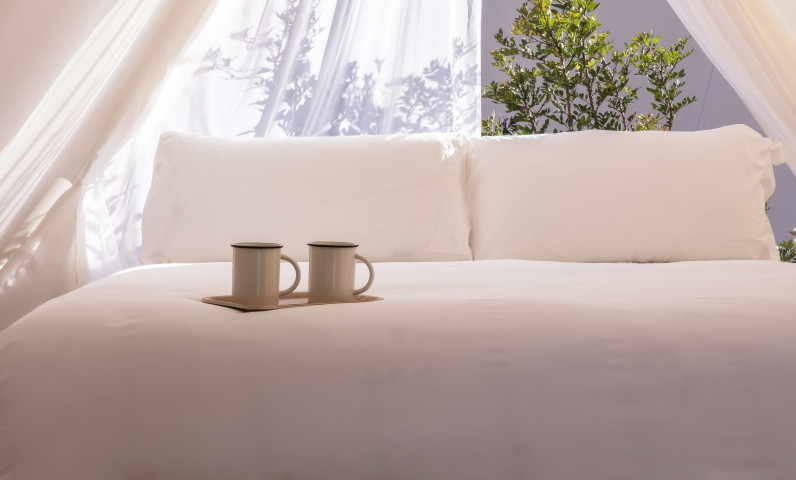 Charming and bright glamping popup tent surrounded by nature perfect for a romantic getaway. Our wooden tent offers all the comforts you are looking for during your stay: double bed on a wooden platform, parquet flooring, sockets to charge your devices, lighting and a mosquito net with 2 sides opening. Perfect for 2 people, it also has a terrace with 2 loungers.