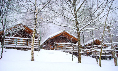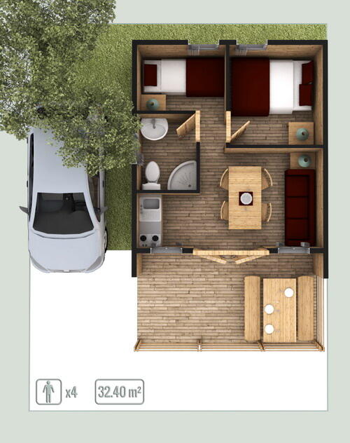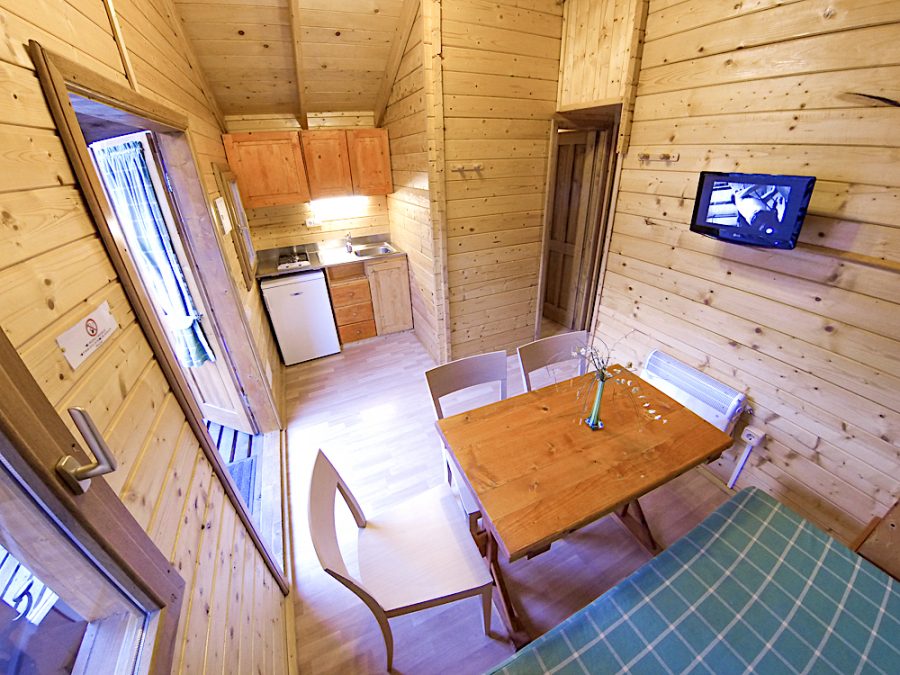 Bungalows of 32,40 m2, with 2 bedrooms and capacity for 4 people. Located in the elevated area of our campsite. If you are looking for peace, privacy and stunning views, choose these newly built bungalows on the ground floor. Each bungalow has two bedrooms: one with a double bed of 1.35 metres and the other with two bunk beds of 0.80 metres. They include a complete bathroom, a cosy living room with equipped kitchen, microwave and TV. With hot water, heating and a terrace with porch, these accommodations ensure comfort. Blankets are provided for your comfort, guaranteeing a quiet and private retreat in the midst of stunning surroundings.