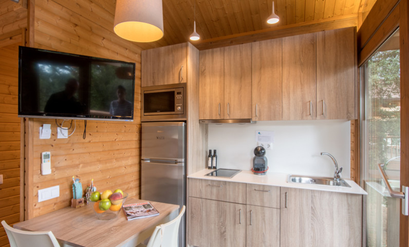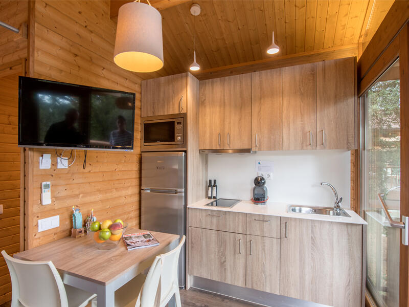 An open-plan kitchen opening onto the terrace and equipped with a Dolce Gusto coffee machine (capsules not provided), cutlery, crockery, kitchen utensils and household items.
