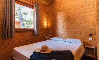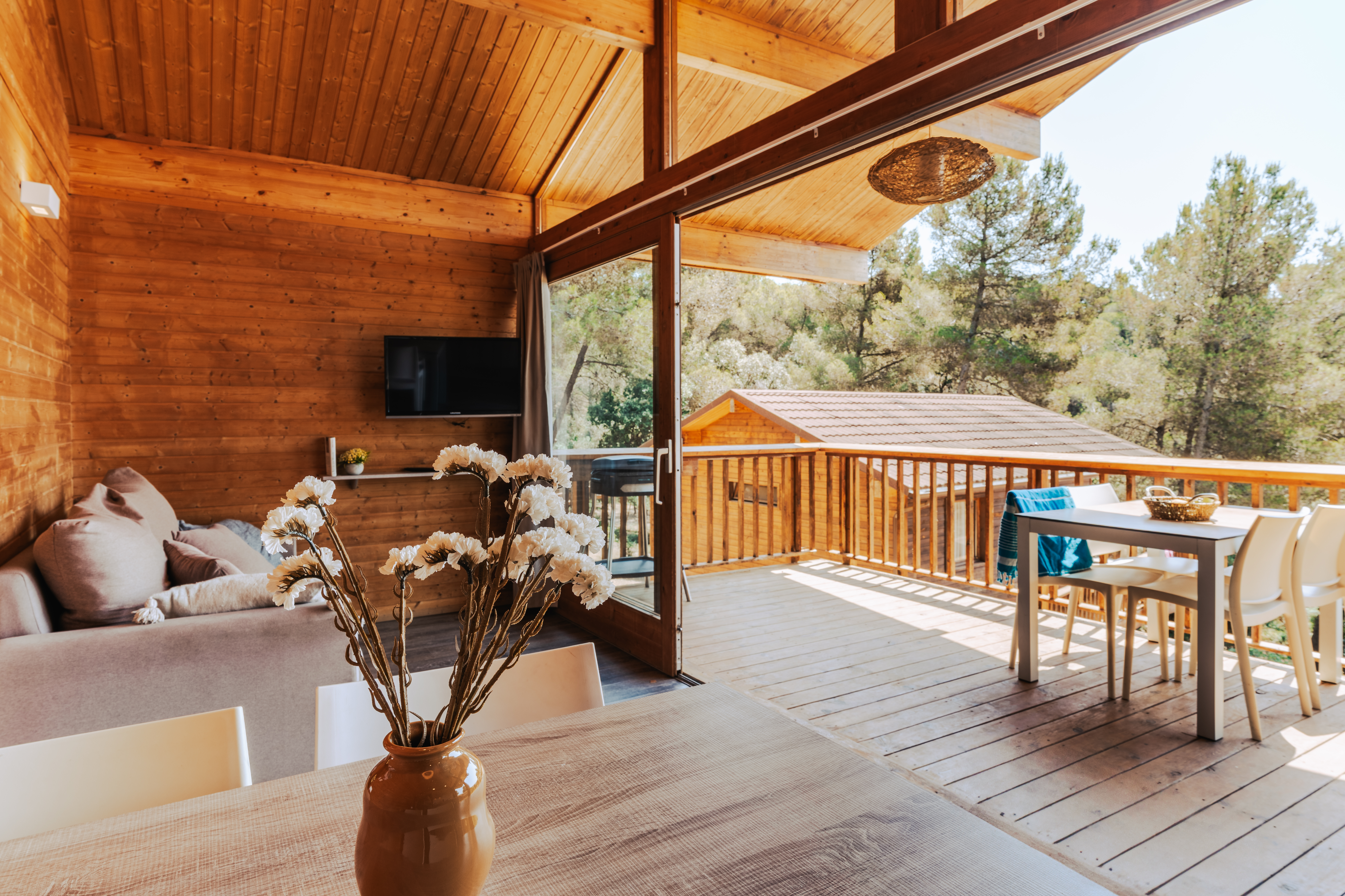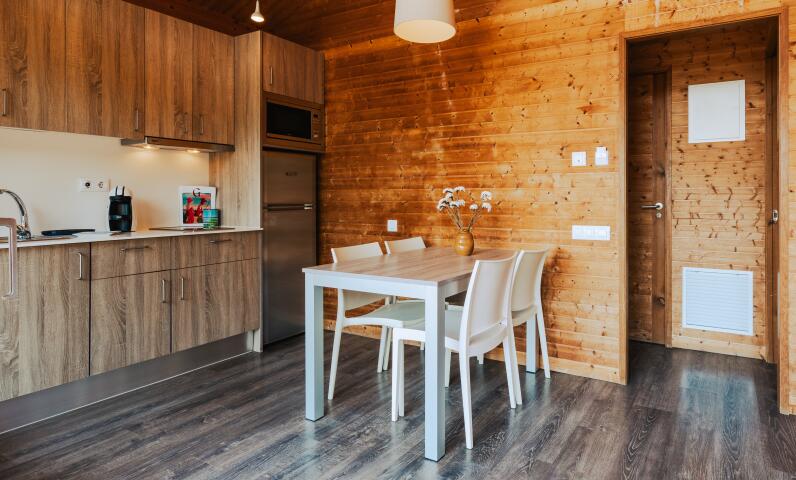1 double bedroom 2 bedrooms with two single beds or 2 bunk beds Kitchen: electric baking sheet, fridge/refrigerator, micro wave, cutlery, crockery, kitchen utensils, expresso coffee maker, Bathroom (with shower) TV, air conditioning, heating, free wifi for a device (wifi codes additional for sale at reception) Furnished covered terrace. BBQ