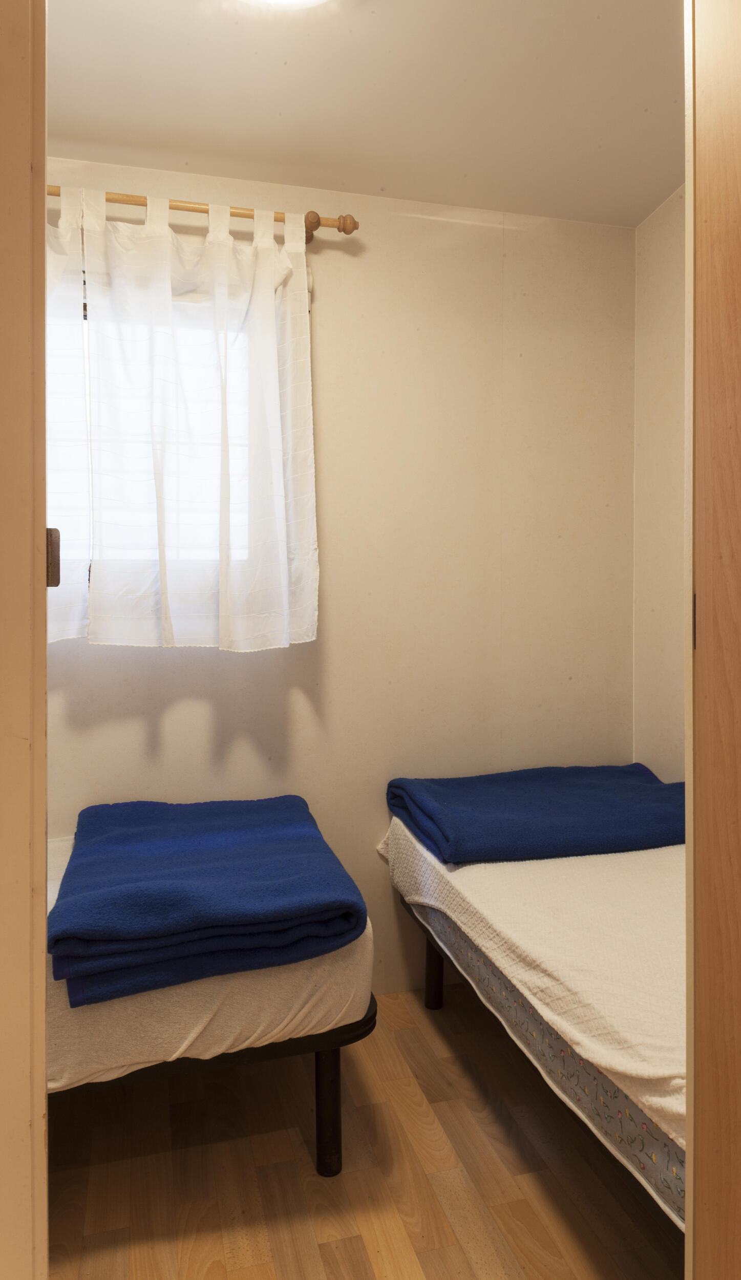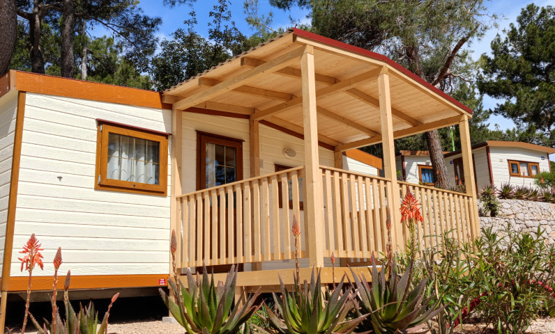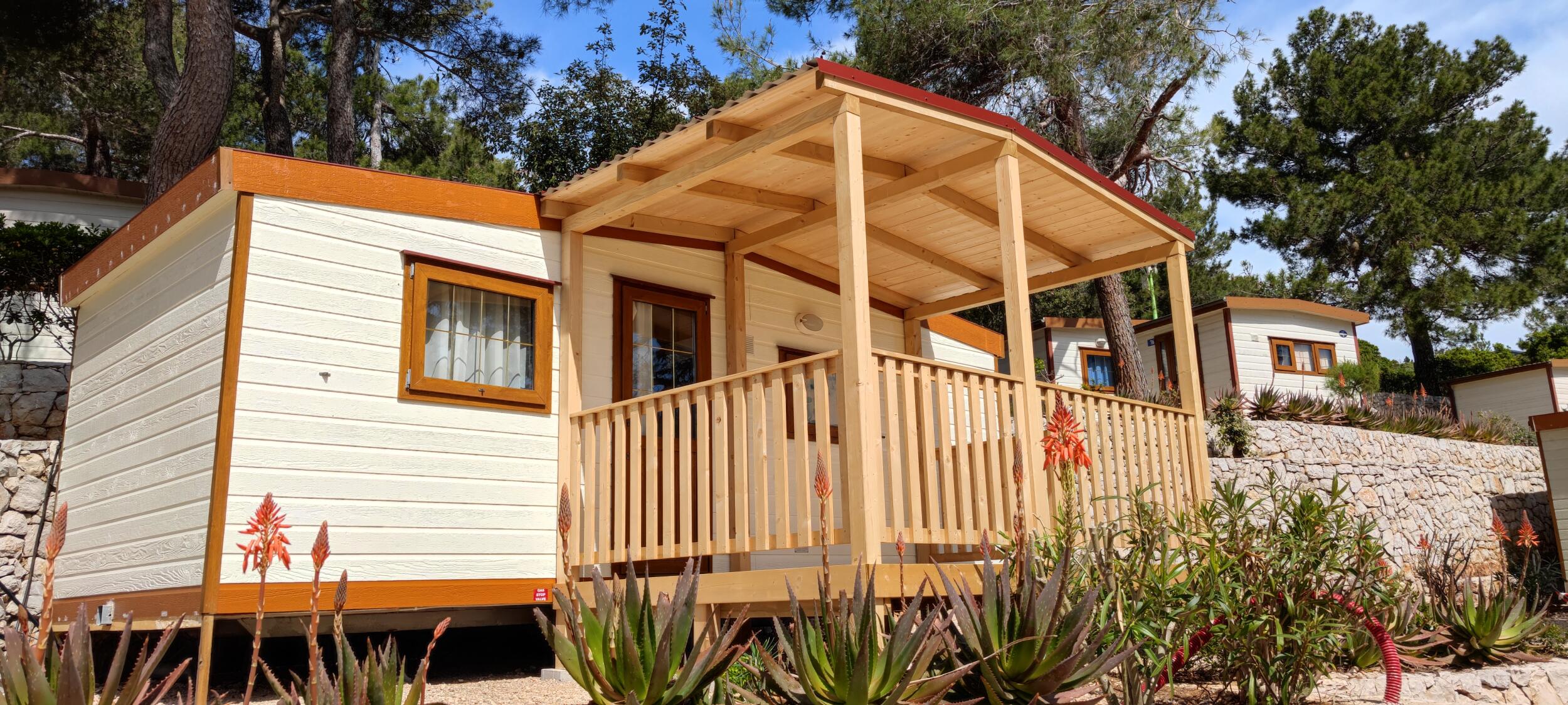 It has an area of 22 sq.m. and can hold up to 4 persons. It is composed of a living room with table and corner seating obtained from a comfortable sofa, a kitchenette equipped with a fridge with icebox, a 4-burner gas cooker, a sink, pots and pans and dishes. Complete the accommodation 2 bedrooms, one with double bed and one with 2 single beds, 1 complete bathroom with WC, shower and washbasin and 1 small bathroom with WC and washbasin. Outside, a covered wooden terrace with table and chairs: the ideal place to relax and enjoy an outdoor holiday.