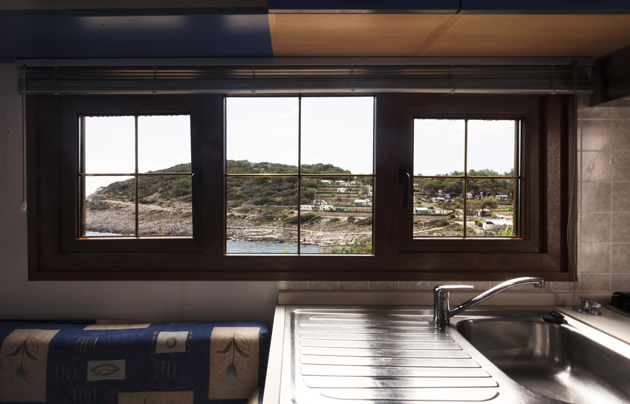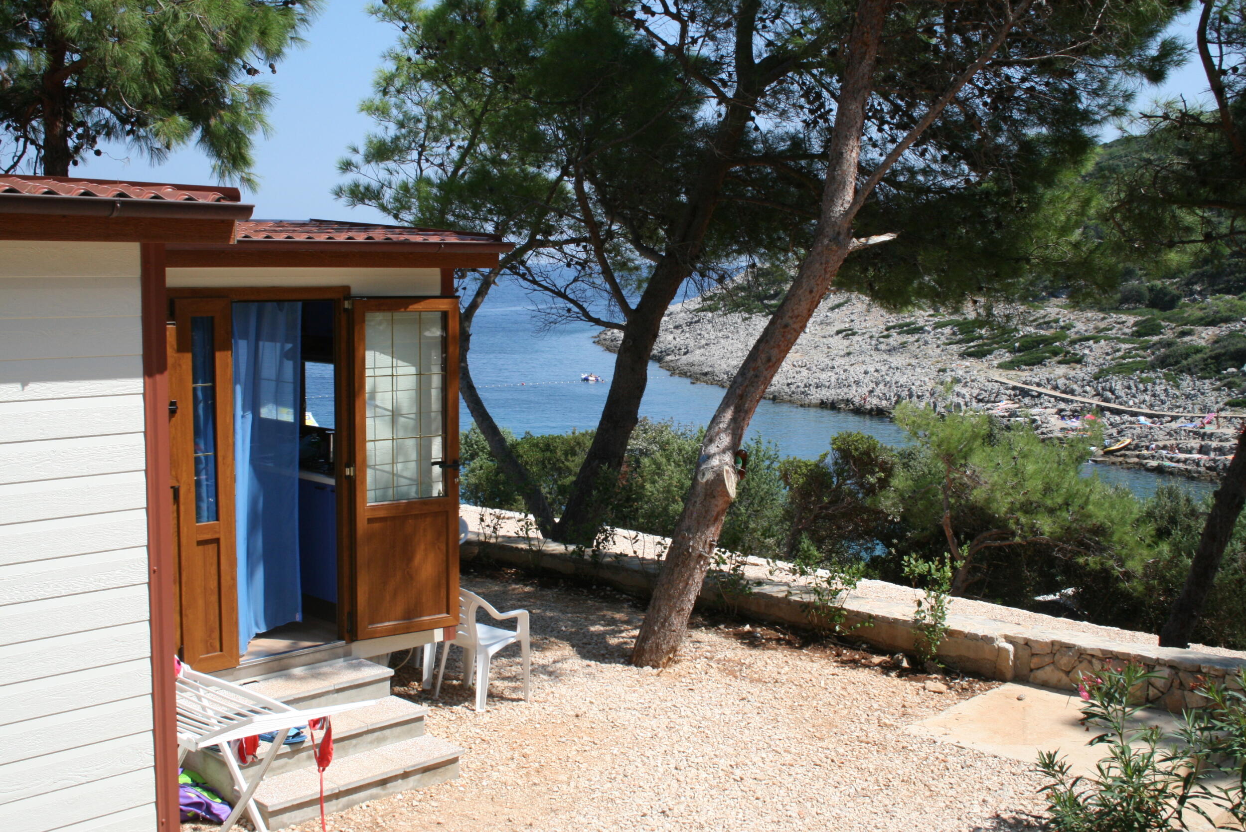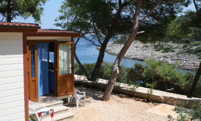 It has an area of about 31 sq.m. and can hold up to maximum 4 adults and 1 child. It is composed of a living room with table, chairs and a sofa bed, a kitchenette equipped with a column fridge with freezer, a 4-burner gas cooker, a sink, pots and pans and dishes. The sleeping area consists of 2 bedrooms, one with a double bed and a generous bedroom with 2 single beds (they can be joined together) and a third raised bed. The accommodation has 1 spacious bathroom complete with WC, shower, bidet and washbasin. Outside there is a covered wooden terrace with a table and chairs where you can relax and enjoy your outdoor holiday.