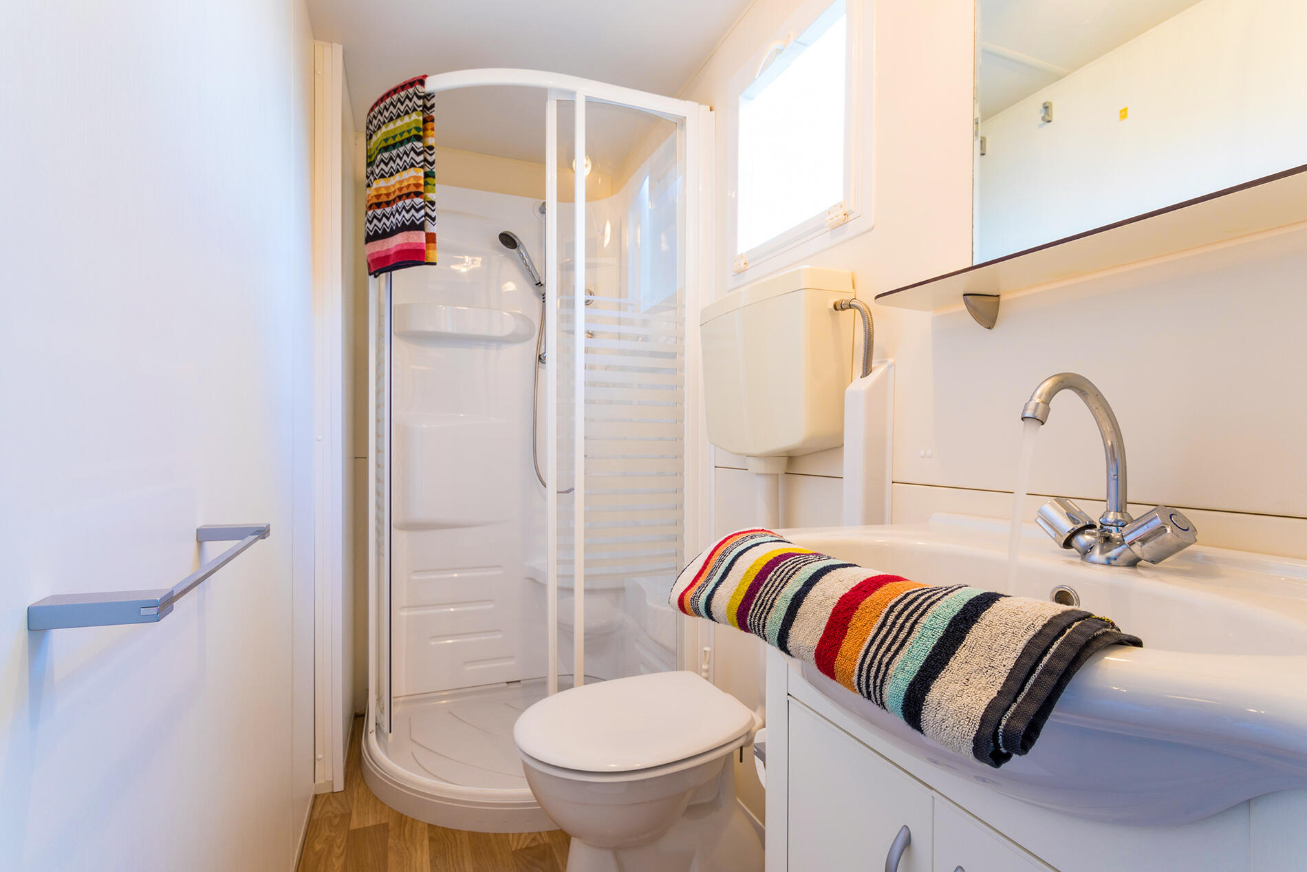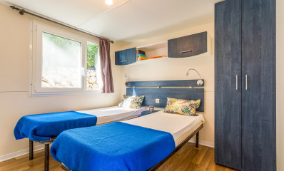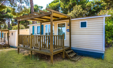Baia Superior: it has an area of approximately 32 square meters, and can contain a maximum of 4 + 1 persons. It consists of 1 bedroom with a double bed, 1 bedroom with 2 single beds, two bathrooms with toilet, shower and basin, one of which is directly accessible from the master bedroom, living / dining room with table, chairs and sofa bed, kitchenette with sink and refrigerator. Outside garden with table and chairs. The mobile home includes satellite TV, cutlery, crockery, blankets and pillows.